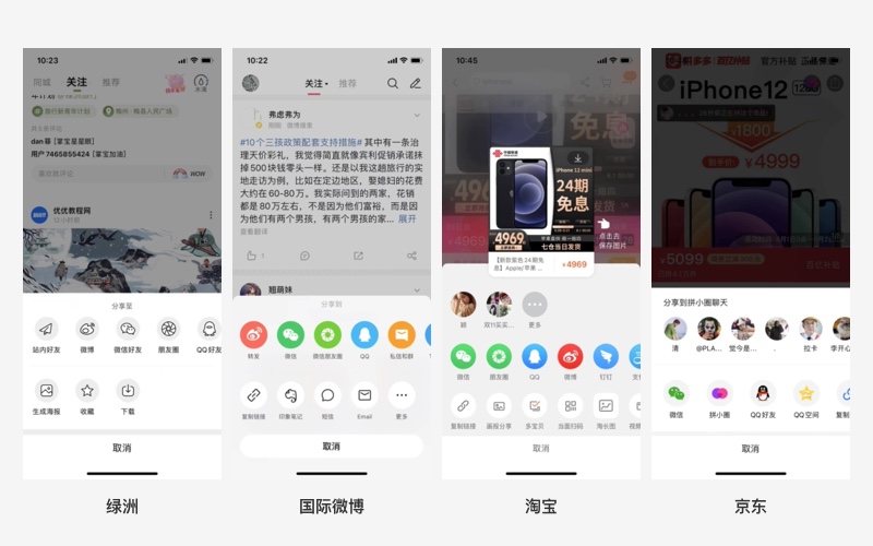 2.分享的渠道:微博、微信、朋友圈(微信)、qq好友、支付寶、釘釘、各種郵箱等,復制鏈接,生態(tài)內(nèi)分享(分享到站內(nèi)某個群,個人)。
