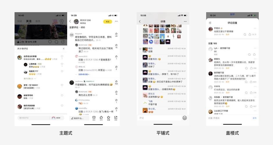 b.平鋪式(展示結(jié)構(gòu)將一級評論與二級評論同等看待,誰回復誰依次平鋪展示)