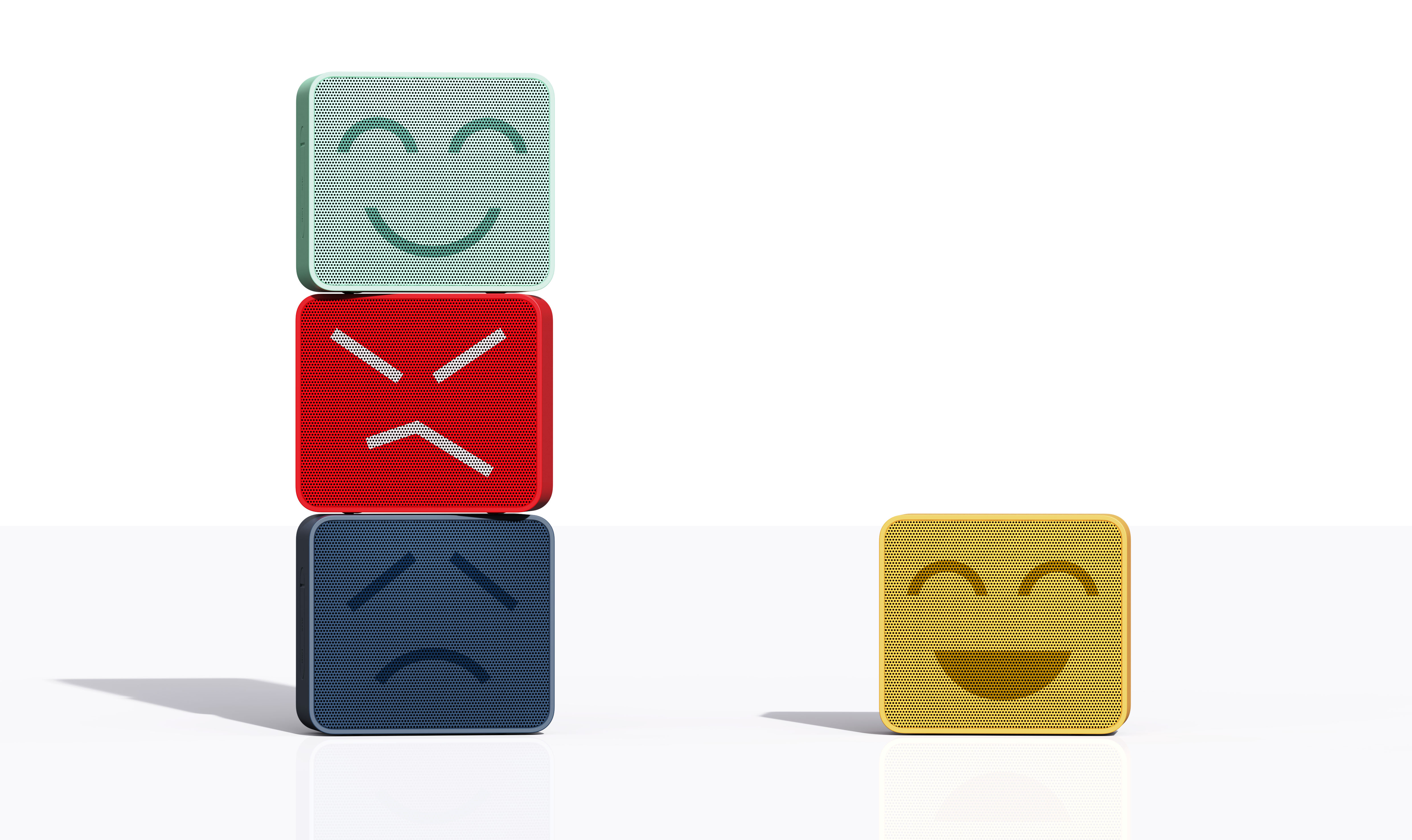 下圖藍牙音響融入了喜怒哀樂四個表情來豐富藍牙音響空白的鐵網(wǎng),讓音響來表達你的心情,對于市面上的藍牙小音響來說,基本都是簡單的幾何,難以做到差異化或者讓人眼前一亮的效果。把聊天軟件常用的表情噴涂在音響,可以讓小小音響像是充滿活力跟生命,不再是個冷冰冰的數(shù)碼產(chǎn)品。