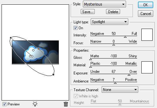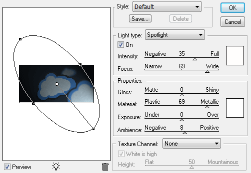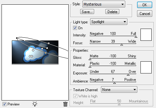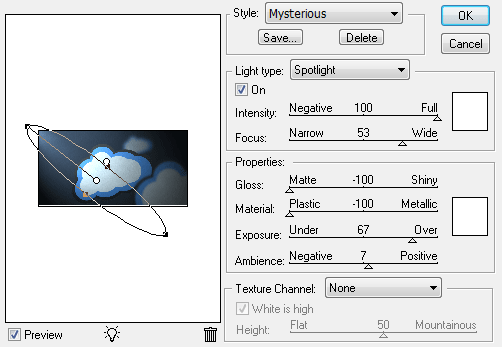 從這里–風格,你可以選擇一個預設的方式來與許多PS圖象處理軟件,或使用“默認”的照明設置(如上所示)。