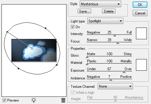 只要按確定應用你的照明效果的過濾器,和你所有的設置去。如果事情不好看,就松開濾波,去濾鏡>渲染>燈光效果。它將繼續(xù)安裝之前使用的,所以你不應該做任何修改的麻煩!