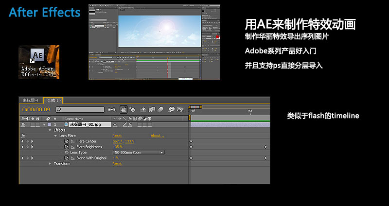 在flash的設(shè)計過程中炫麗的效果是我們要考慮的因素,我相信絕大部分美術(shù)設(shè)計出身的設(shè)計師們對于代碼都感到頭疼,就算是簡單的AS2.0他們都覺得像天書一樣。但是AS是單純用flash來實現(xiàn)特效的唯一方法,那么就發(fā)散一下思維吧,用我們的長處來彌補一下我們的不足。用AE吧 傳說中的三維世界的ps 以各種編輯特效而著稱。界面你一定不會感到陌生 ,有著ps的圖層系統(tǒng) 和flash的timeline 入門很簡單 難就難在插件的應(yīng)用上,要學好可不容易哦。在制作過程中一定要注意,體積是我們不可小視的問題。在互聯(lián)網(wǎng)的世界里誰都沒有時間去等待我們的特殊效果。在AE中制作好特效后我們可以導出序列圖片,把序列圖片到flash里。你會發(fā)現(xiàn)體積大了 也可以刪除序列圖片的張數(shù)來減少體積(如:刪除2 4 6 8 10幀)在真正的播放中是看不出來斷幀的,但是體積缺縮小了很多。在flash的世界里也可以用loading的華麗制作來彌補體積太大帶來的不足。
