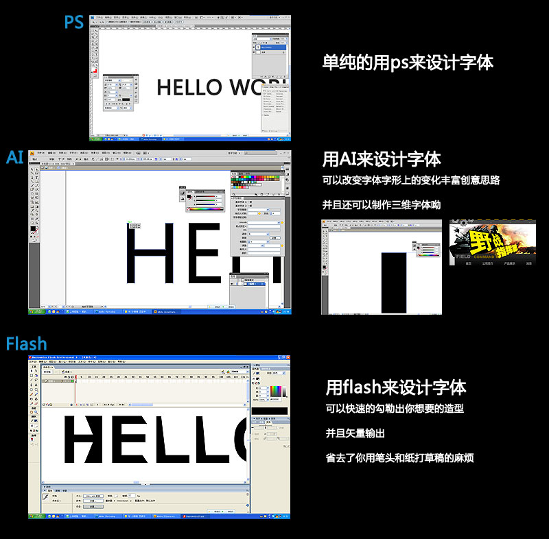 設(shè)計最基本的軟件是photoshop 在字體設(shè)計的過程中,如果你單純的用ps來設(shè)計字體的話那么你的創(chuàng)意往往會被制作方法而磨滅。換個思路你可以使用AI來制作你的字體呀,制作好直接拖動到ps中就可以滿足你的需要了,創(chuàng)建三維字體也是AI的利器呀。不要以為flash只是動畫設(shè)計師的玩物,平面設(shè)計完全可以用flash(至少可以打打草稿吧),要記住發(fā)散思維。