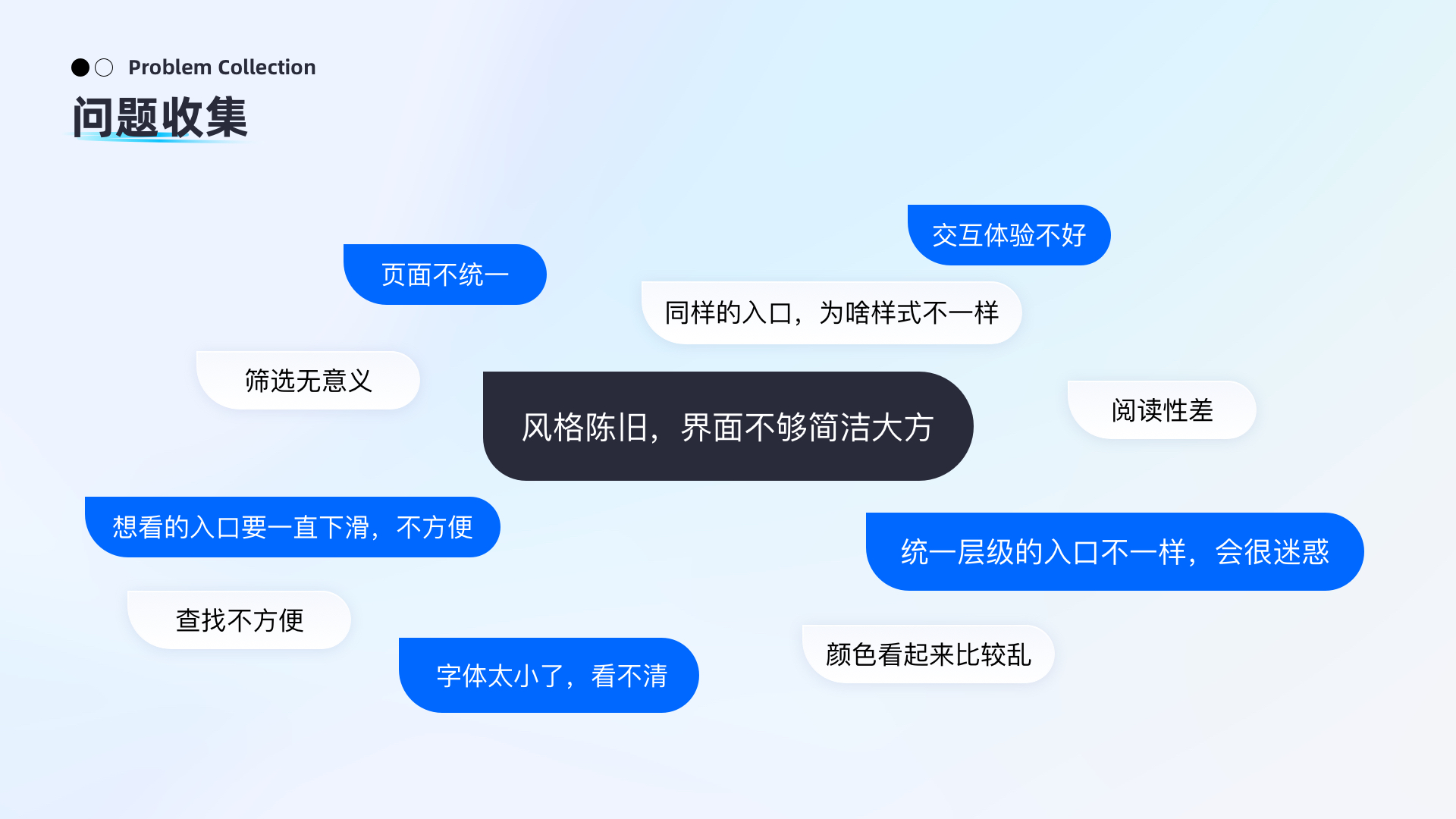 在我們著手設(shè)計前,對當(dāng)前線上的問題梳理一下,確定目前存在的問題,才可以知道如何針對性的去改版優(yōu)化。通常會有以下幾個典型的問題: