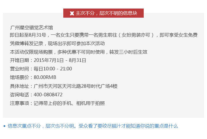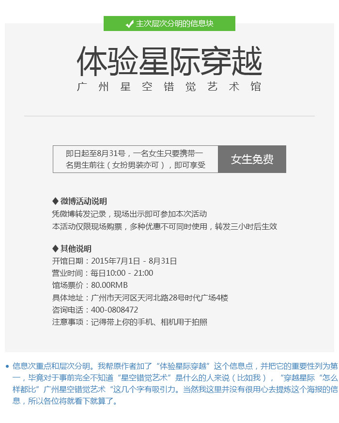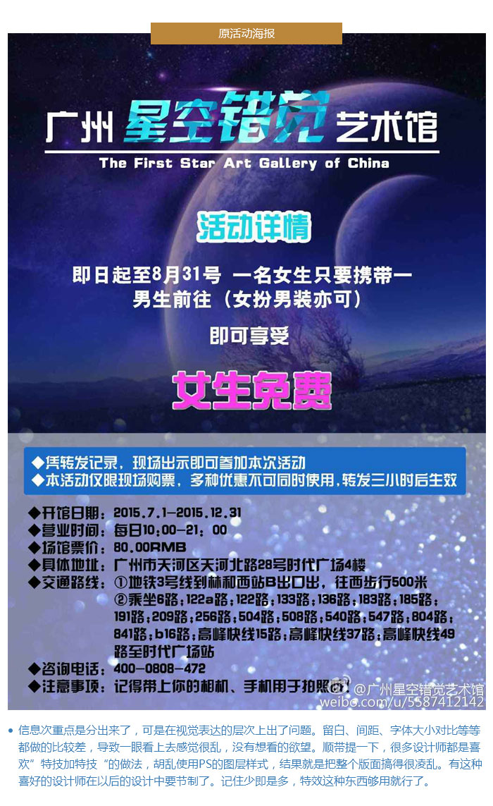 關(guān)于準(zhǔn)確清晰地傳達(dá)信息,我們先來看一個案例:“廣州星空錯覺藝術(shù)館”的微博活動海報。海報的設(shè)計師你不要怪我...