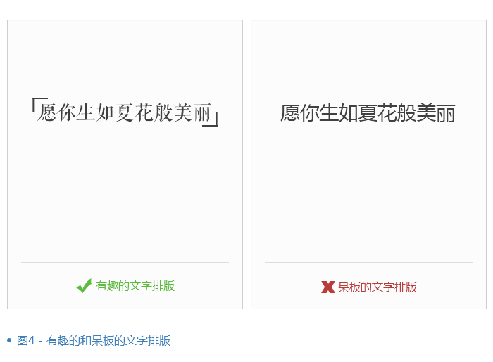 要表現(xiàn)“有變化、不呆滯”,一種常見的手法是對比。對比可以是大小、方向、材質(zhì)、顏色和形狀等等各方面(只要你想得到)的對比。畫面里有了對比,就可以給予其變化。來看一個例子:有趣的和呆板的文字排版(圖4)。