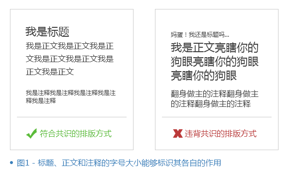 先舉一個簡單的例子:標(biāo)題、正文和注釋的字號大小能夠標(biāo)識其各自的作用(圖1)。