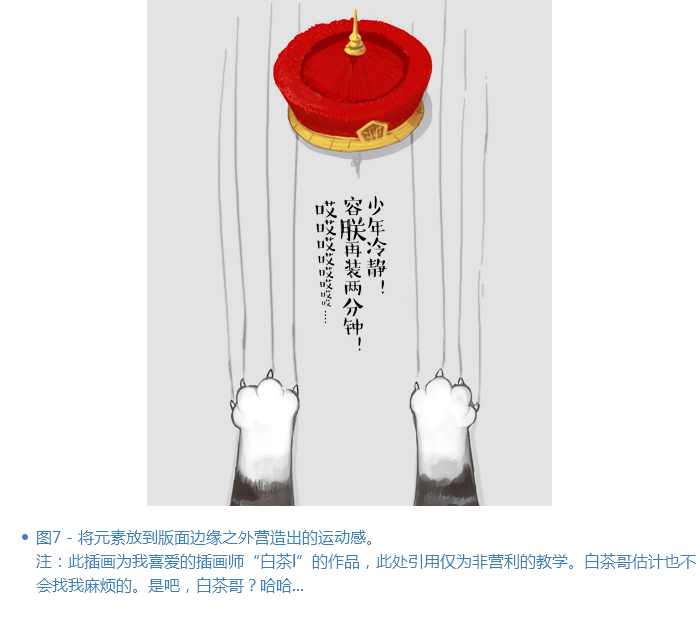 有趣的另外一個外延含義是“不是司空見慣的”。平面(二維)對于大部分人而言意味著靜止和沒有空間縱深感,這是我們大部分人對于平面的刻板印象。所以為了讓版面變得有趣起來,我們要做的就是將三維世界的動勢和空間感,以各種手法從視覺上在平面世界模擬再現(xiàn)。其中一種手法就是將元素的一部分放到版面邊緣之外,利用受眾的想象力,讓他們覺得元素正跑到畫面外面去,從而營造出一種運動感(圖7)。