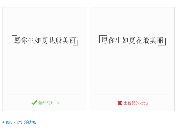 上圖左邊的案例有兩個地方的對比讓版面顯得有趣:(1)字體筆畫本身富有變化對比;(2)文字與折線圖片的形狀和大小上的對比。但是進(jìn)行對比一定要注意讓對比明顯一些,如果對比不明顯還不如不要對比,而是采用讓元素統(tǒng)一的手法,讓畫面統(tǒng)一感強一些。記住,要對比就大膽一些去對比(圖5)。