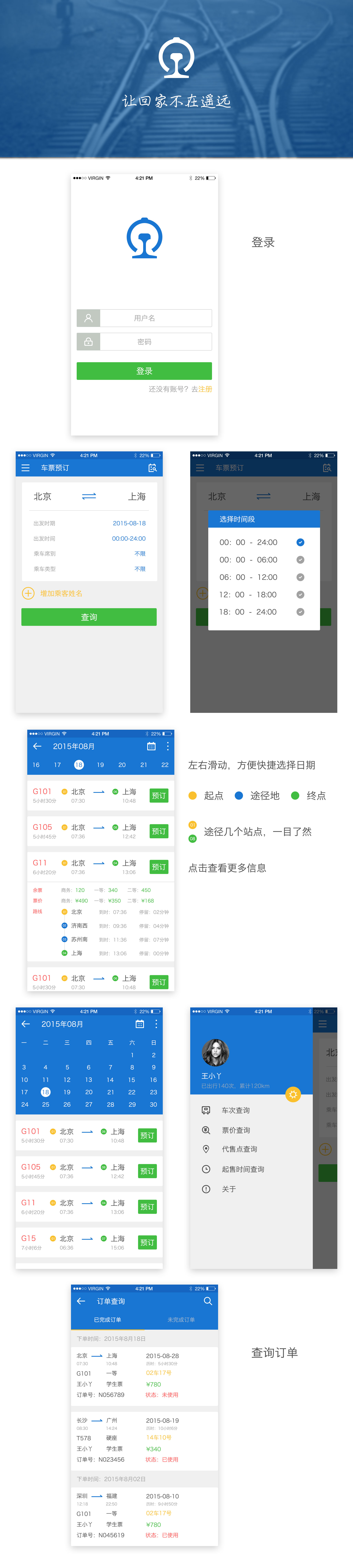 1.車票查詢;在這個頁面中可以吧車票查詢的文字去掉,這樣導航的簡潔性會高些。細節(jié)上城市位置的切換和小三角放在一塊容易引導用戶誤操作。