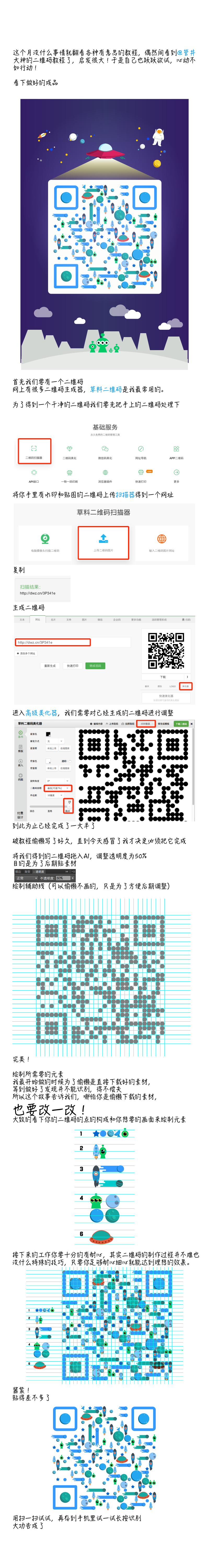 做了一些小的調(diào)整,也有很多人說做的時(shí)候經(jīng)常識別不了但是可以掃一掃,出現(xiàn)這種情況的話先檢查點(diǎn)的覆蓋是否準(zhǔn)確,其次調(diào)整整體的顏色,二維碼的黑色的點(diǎn)和白色的點(diǎn)的對比度一定要拉開,這樣才會提高識別率。如果出現(xiàn)了其他的什么問題請給我留言,我很愉快為大家解答!