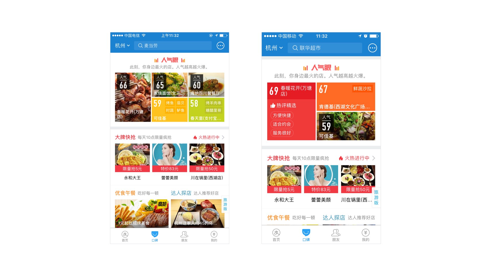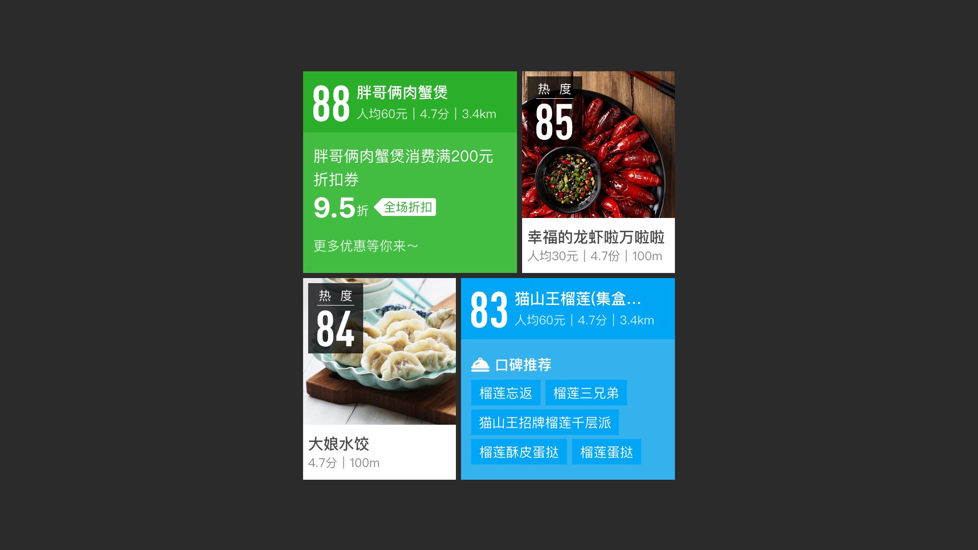 人氣眼主頁的布局上采用大中小卡片的組合形式,區(qū)別于過往列表式或中規(guī)中矩的卡片式布局,以營造一種人氣眼熱鬧“街市”的景象。卡片大小的差異,讓眼動瀏覽更有順序,而每個卡片的信息由于商家本身的內容差異,加上美食秀、彈幕等元素使得各家店鋪個性更加鮮活。以營造一種讓用戶置身于逛一條熱鬧的人氣眼街,街上的每家店內容又很豐富多彩。