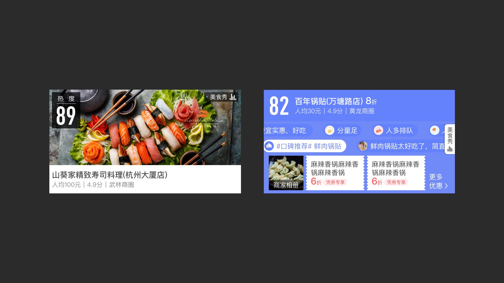 大卡片:正面采用視頻秀的方式,把商家最吸引人的精美圖片最大化表現(xiàn),成為這家店的表演舞臺。把用戶的眼睛聚焦到這里,當商家的這場“Show”演出完畢時,則進入信息卡,信息卡展示商家的核心信息。并采用彈幕的形式,以解看完“Show”之后的意猶未盡,并能看到用戶的客觀評論或吐槽,進一步拉近商家與用戶的距離。
