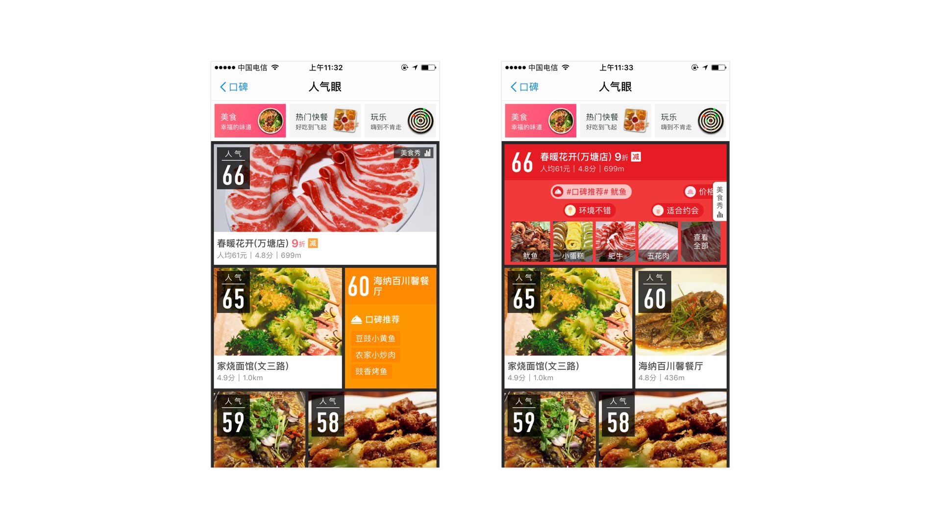 人氣眼入口作為一個展示區(qū),目的是吸引用戶點擊進入人氣眼主頁。經過測試發(fā)現(xiàn)用戶并不會第一時間在此決策,并且用戶對菜品圖和菜品名的關注度很高。