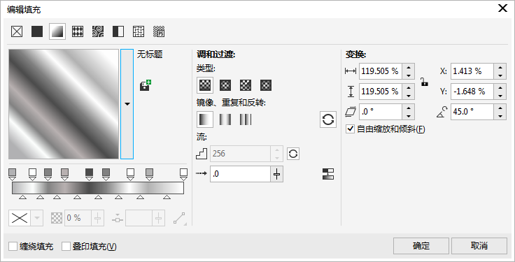 步驟三、填充漸變色 按快捷鍵F11,彈出“編輯填充”對(duì)話框,填充為灰-黑-灰的漸變顏色,并去除描邊輪廓。