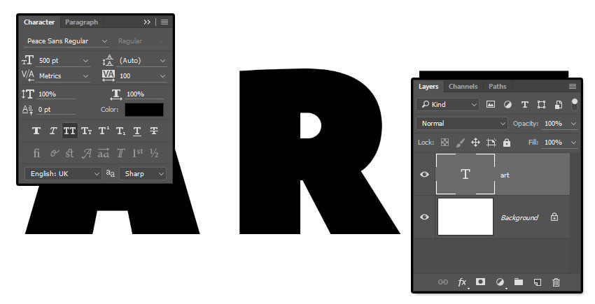 創(chuàng)建一個(gè)1500*1000px的畫布填充白色。使用Peace Sans Regular的大寫字體,字體大小設(shè)置大一些可以將細(xì)節(jié)展示的更好。在這里設(shè)置字體大小為500pt,字體間距設(shè)置為100。你也可以根據(jù)自己的喜好設(shè)置其他數(shù)值的間距。