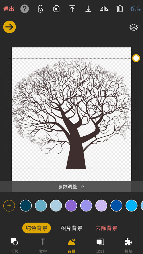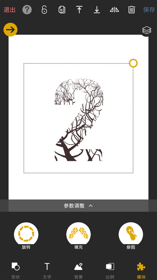 3.點(diǎn)擊右下角“模塊”—修圖,選擇剛剛的透明樹(shù)形png圖片作為底圖。