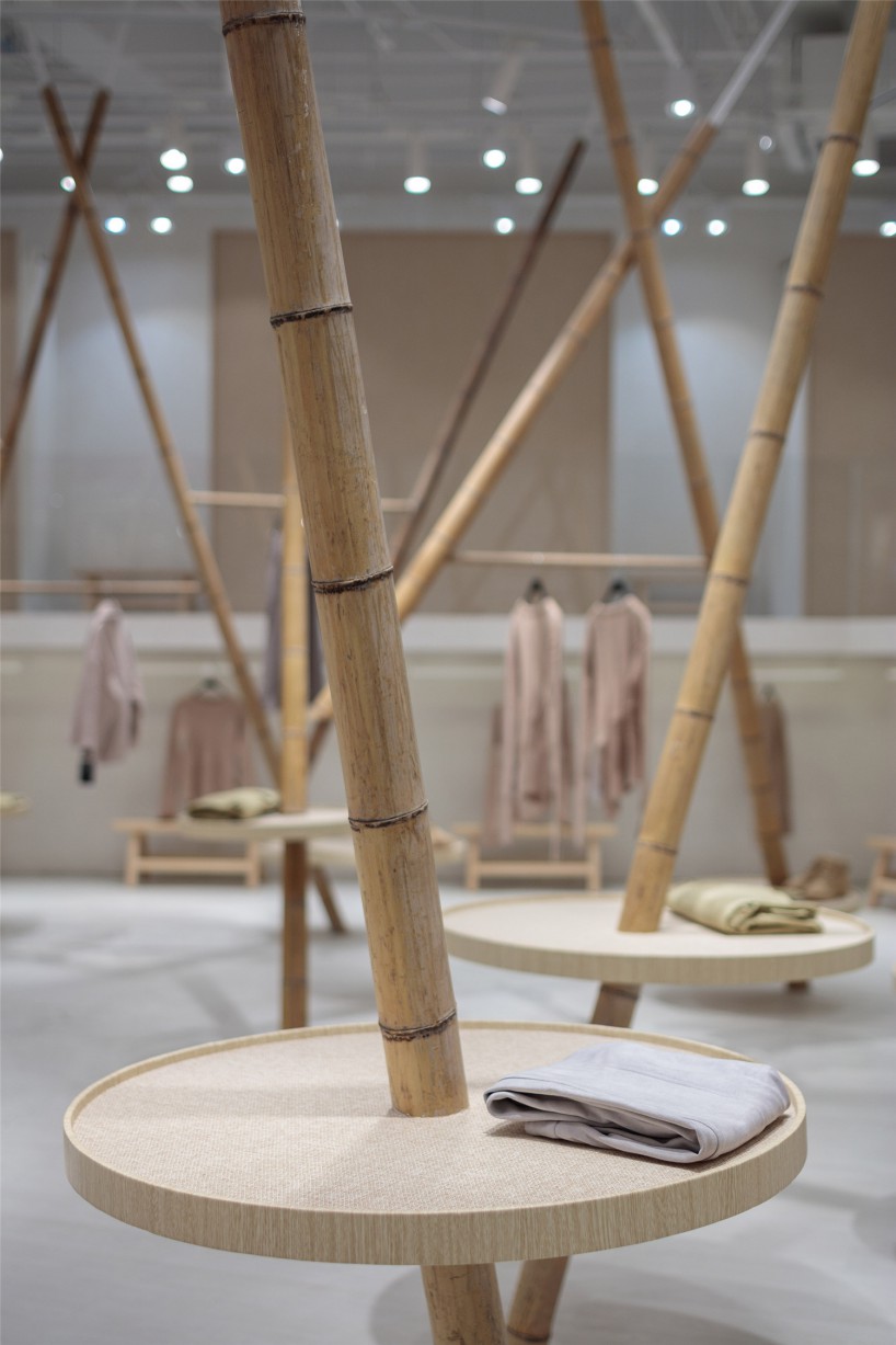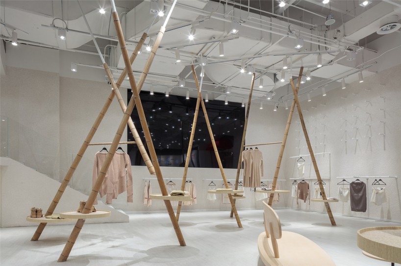 通過(guò)主入口區(qū)大大的門(mén)拱,進(jìn)入到森女區(qū)。乳白色肌理墻面,白色地面,一個(gè)潔白干凈的空間,支立著一根根竹竿并以麻繩做連接,而衣架也就此成型。穿衣鏡則隱藏在兩根竹竿的夾角立面上??臻g明亮簡(jiǎn)潔并用古樸的材料來(lái)呼應(yīng)該空間衣服類(lèi)型的氣質(zhì)。