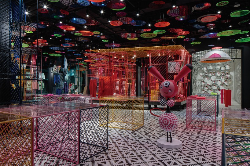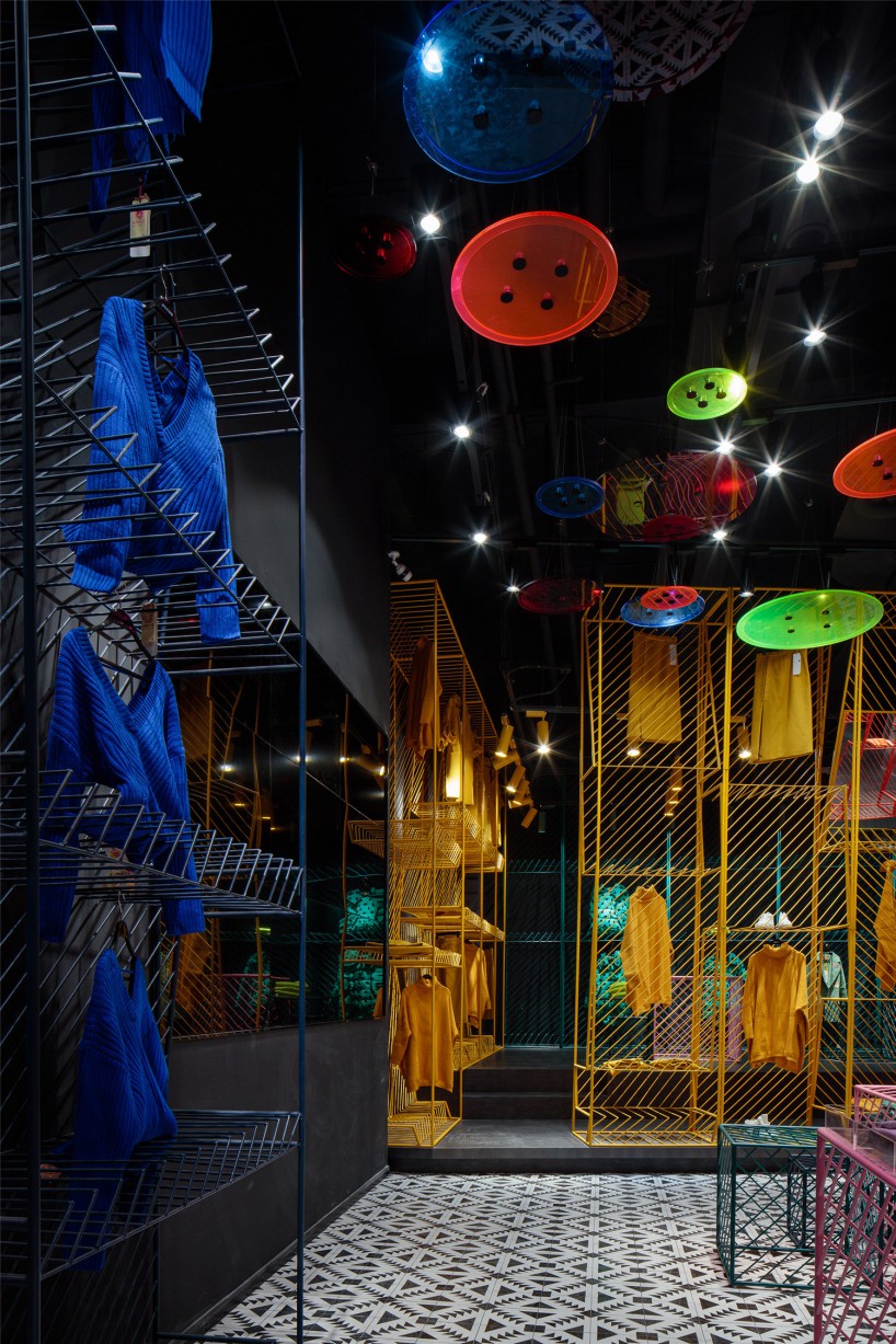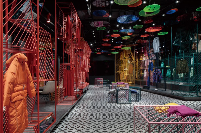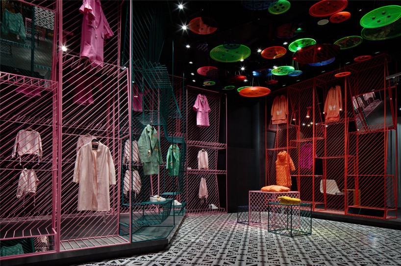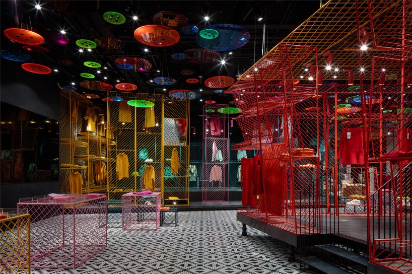 (三)潮女區(qū)大色塊的撞色,由一根根鐵藝曲折而成的彩色貨架,在這個(gè)強(qiáng)調(diào)個(gè)性的空間,利用衣架的前后折度來(lái)分割成雙面掛衣的結(jié)構(gòu),彩色與折線的拼織來(lái)打造幻彩個(gè)性的空間以呼應(yīng)該空間里服裝展現(xiàn)的個(gè)性。
