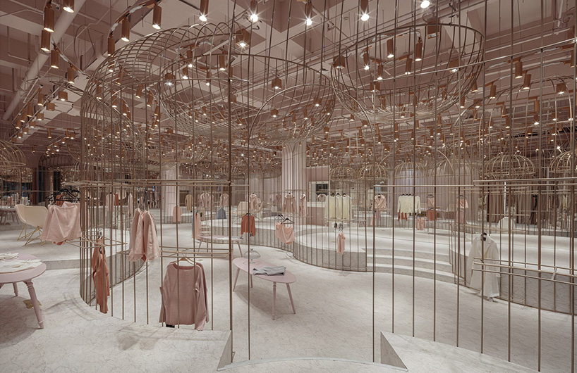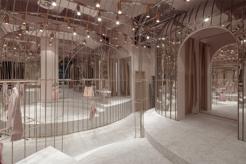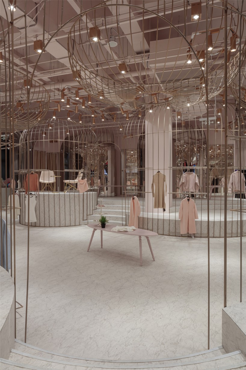 (一)名媛區(qū),一個(gè)個(gè)精致的金絲籠,衣架被放在金絲籠內(nèi)外兩側(cè),遠(yuǎn)看仿若被精心呵護(hù)的公主蓬蓬裙。高低起伏的弧形平臺(tái),增加趣味性的同時(shí)又不失活潑可愛(ài)。試衣間被巧妙的隱藏在弧形鏡面的“蓬蓬裙”內(nèi)側(cè)。同時(shí)每個(gè)試衣間區(qū)域也提供梳妝、休憩、自拍區(qū),等待著每一位公主。