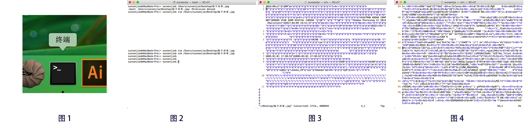打開終端(如圖一),把圖片直接拖進(jìn)去,會(huì)得到路徑,光標(biāo)移到最前面敲命令vim+空格,然后回車,進(jìn)入編輯圖片信息(如圖三)最前面與最后面是圖片基本信息不要編輯,英文輸入法下(接下來都是英文輸入法)按快捷鍵a 進(jìn)入編輯模式接下來,下滑會(huì)看見圖4的編碼(這些是圖片的像素顏色信息),一個(gè)圖片估計(jì)有幾千行,接下來就是刪除(快捷鍵dd),隨即刪除一部分,esc推出編輯模式,最后:w保存(:wq推出保存)