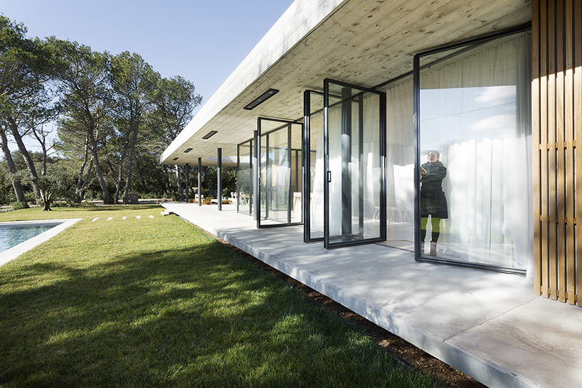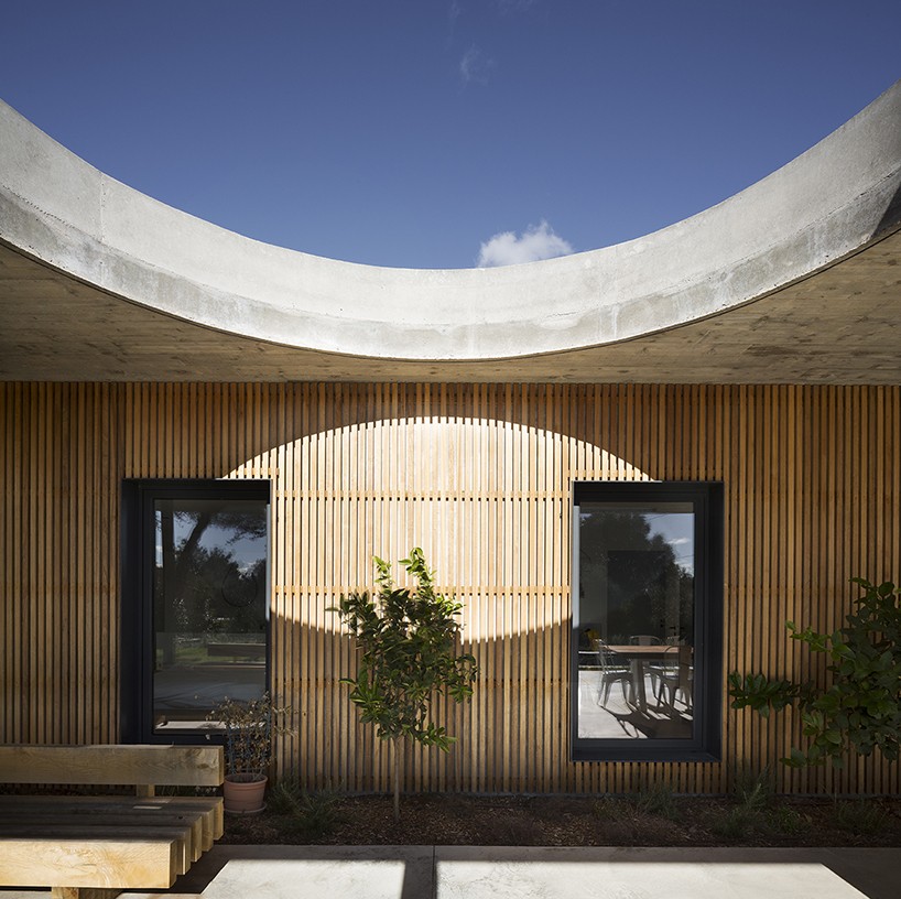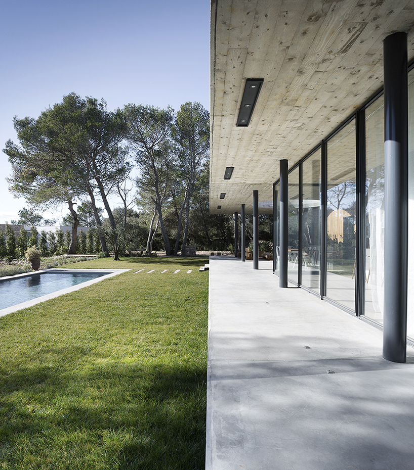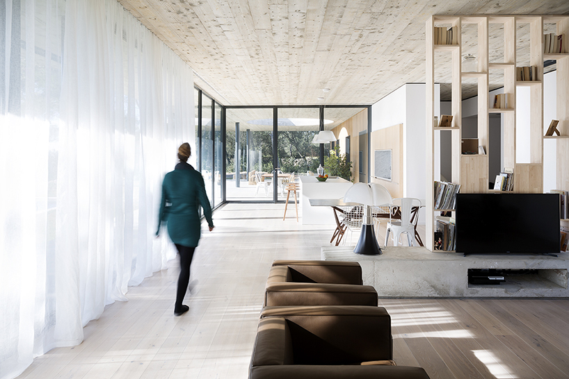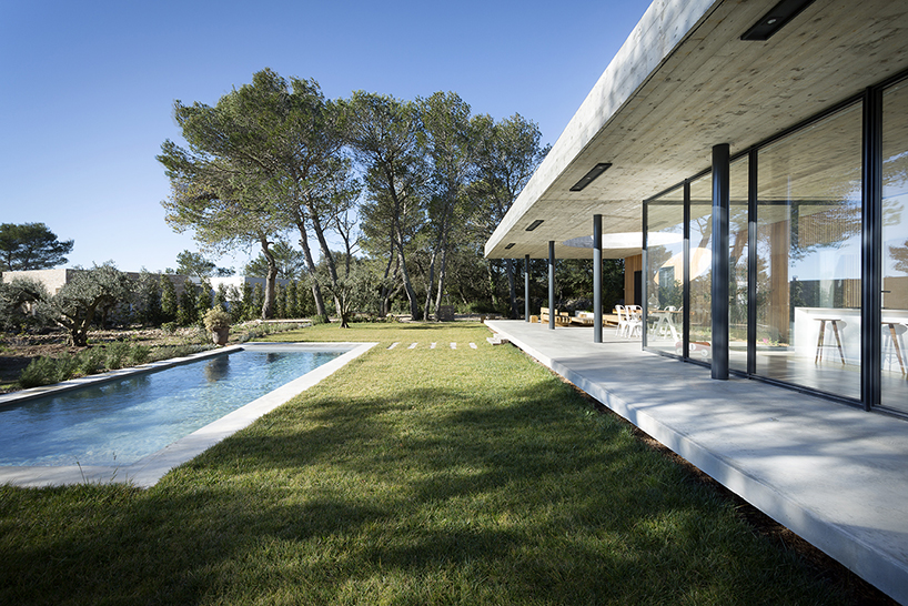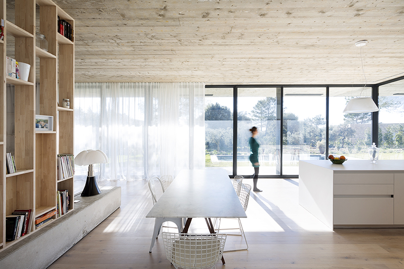 位于法國(guó)南部的尼姆城,這棟家庭式別墅由當(dāng)?shù)毓?nbsp;pascual architecte進(jìn)行設(shè)計(jì)。整棟建筑的結(jié)構(gòu)以水平性概念進(jìn)行建造,而為了內(nèi)外部景色的融合則在起居室采用落地式大開(kāi)窗。整棟建筑安置在連接門(mén)廊與內(nèi)室的微微隆起的平臺(tái)之上。起居室一直延展到室外平臺(tái)之上,平臺(tái)之上的屋頂中心處被挖出一個(gè)呈圓形的空洞,以此作為一個(gè)陽(yáng)光光井照在平臺(tái)之上的娛樂(lè)用餐區(qū)上。