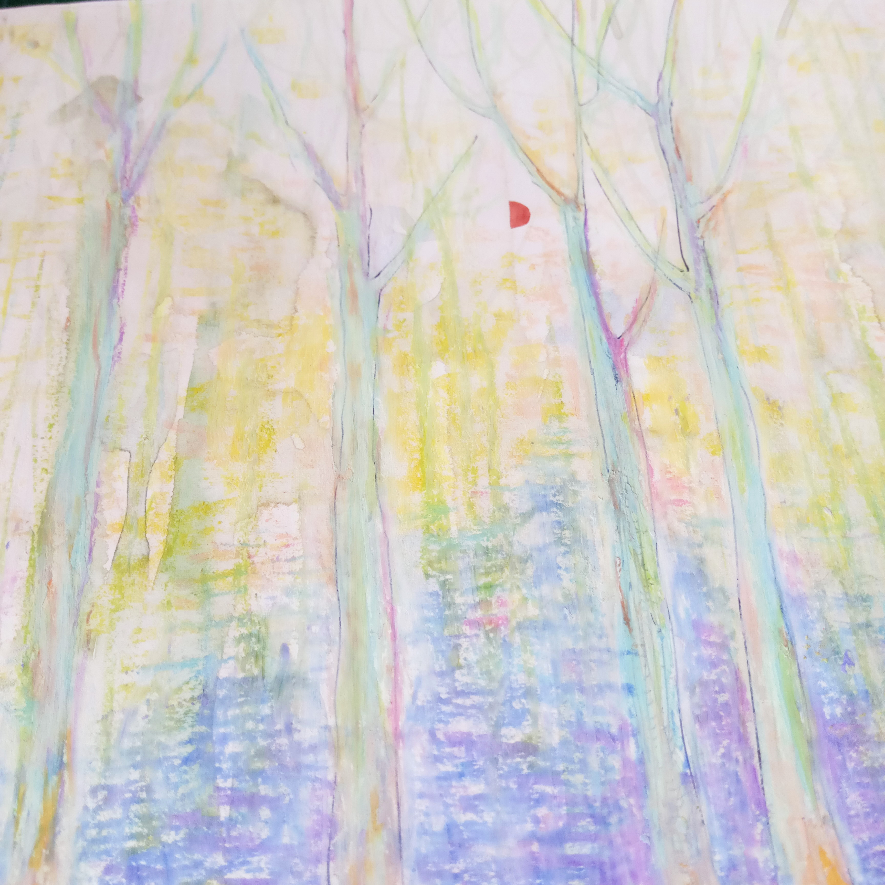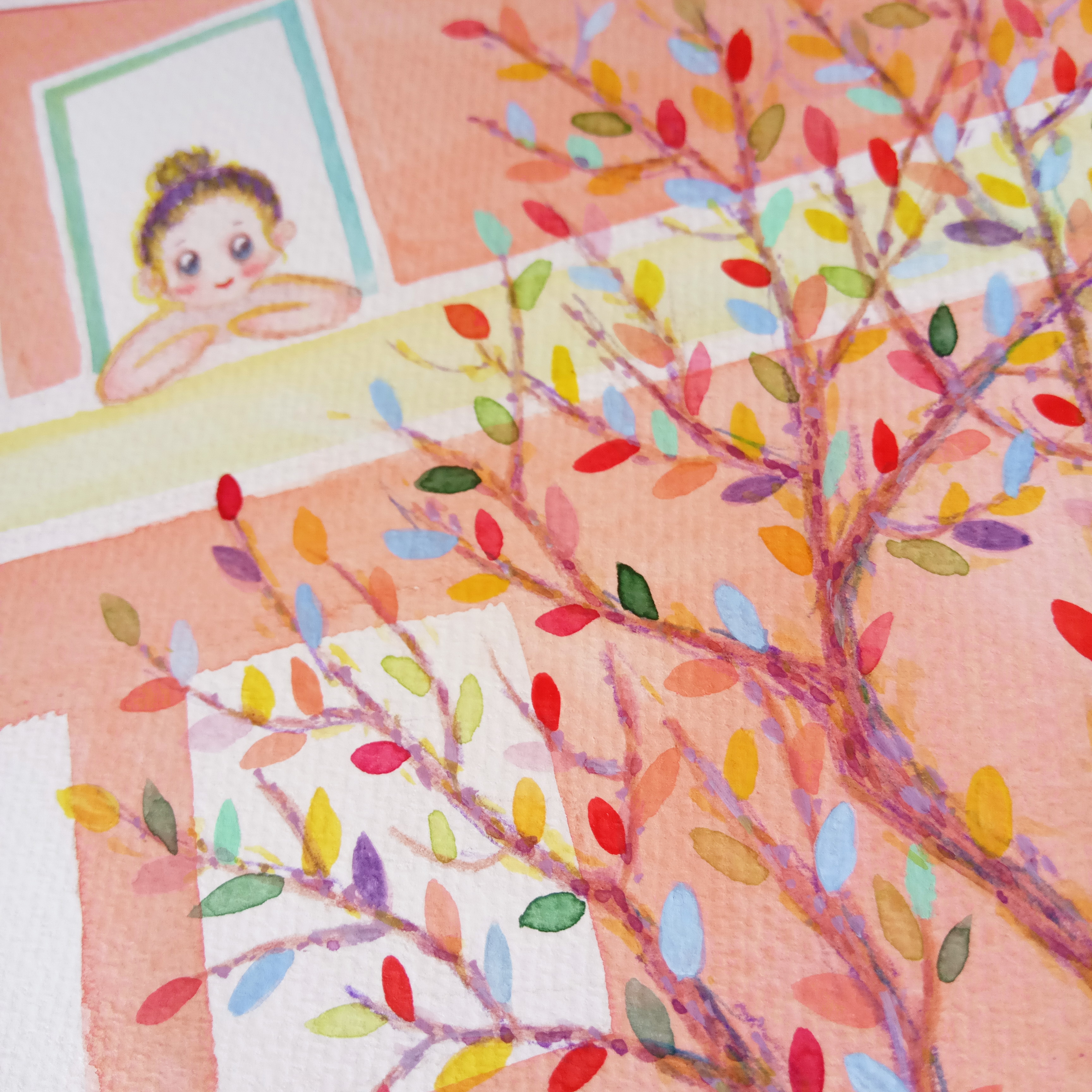 這張是一個(gè)主題繪畫(huà)。我們整日整日憋在一個(gè)小房子里畫(huà)吖畫(huà),累了就趴在窗戶(hù)上向外看,外面長(zhǎng)著一顆結(jié)滿(mǎn)靈感的樹(shù)。(展示局部)