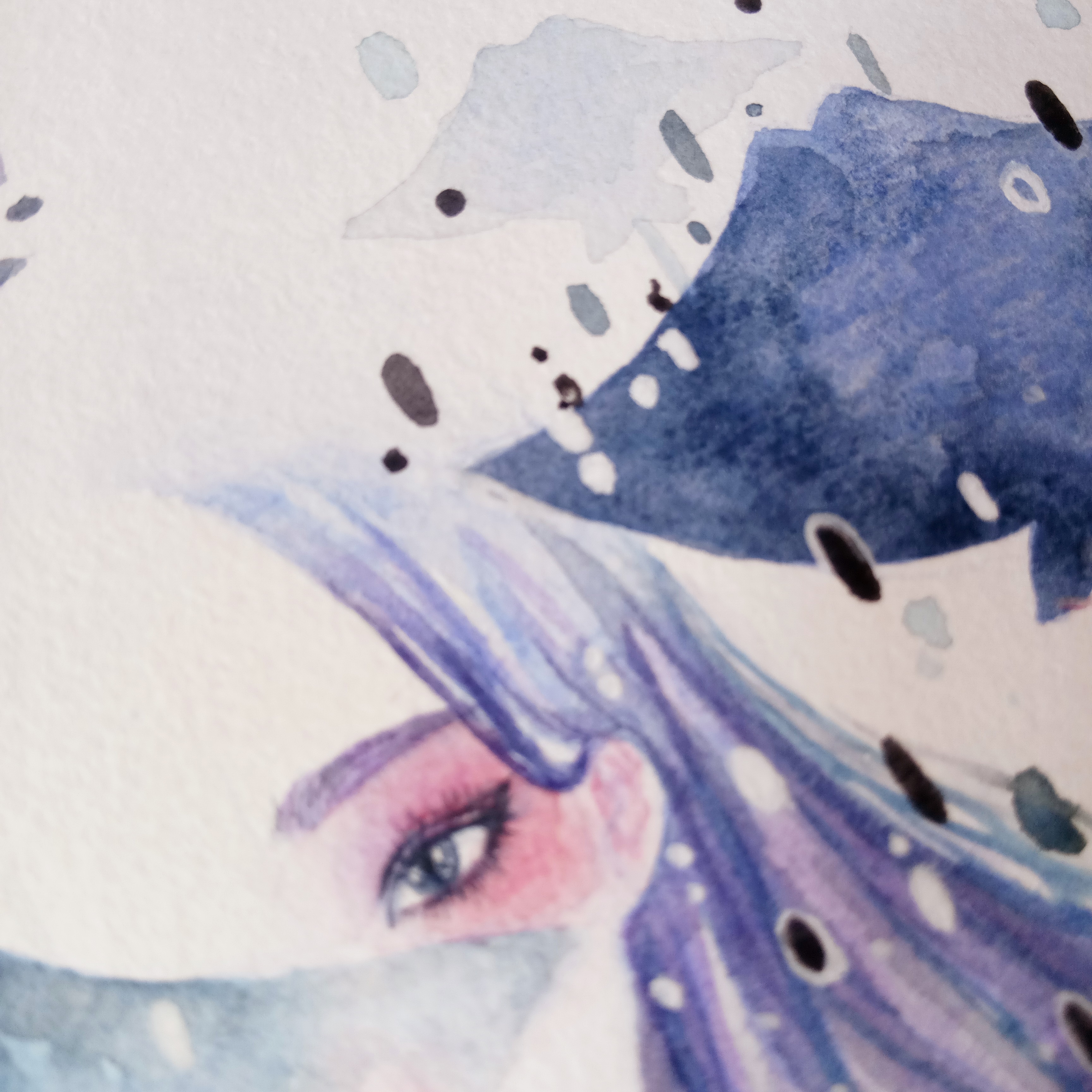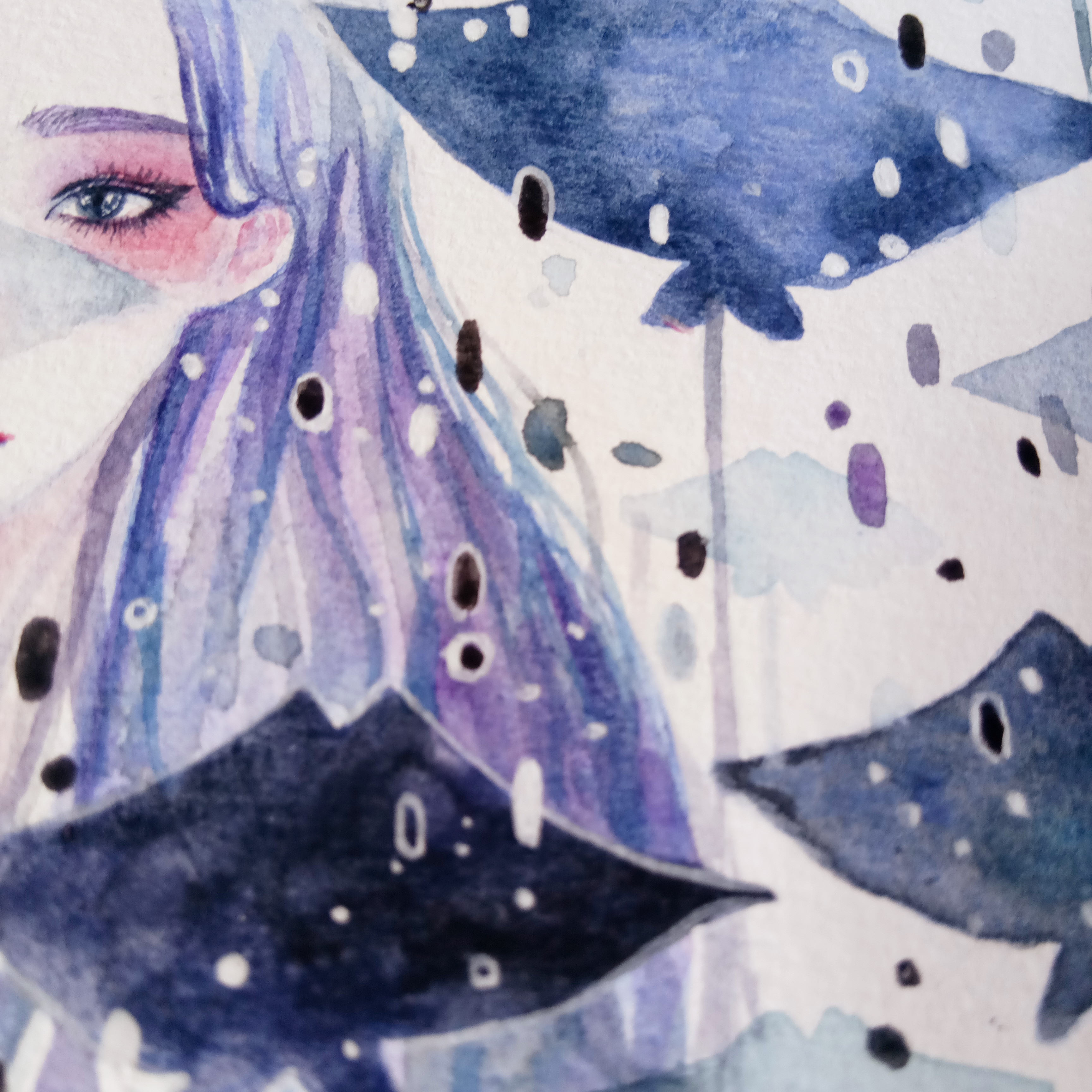 下面這幅出現(xiàn)巨大的轉(zhuǎn)折點(diǎn)點(diǎn)點(diǎn)。它的真身是一張隨意的簽繪。意向不明的白色點(diǎn)點(diǎn)既是雪,又是光。因這朋友喜歡旅行喜歡雪。(展示局部)