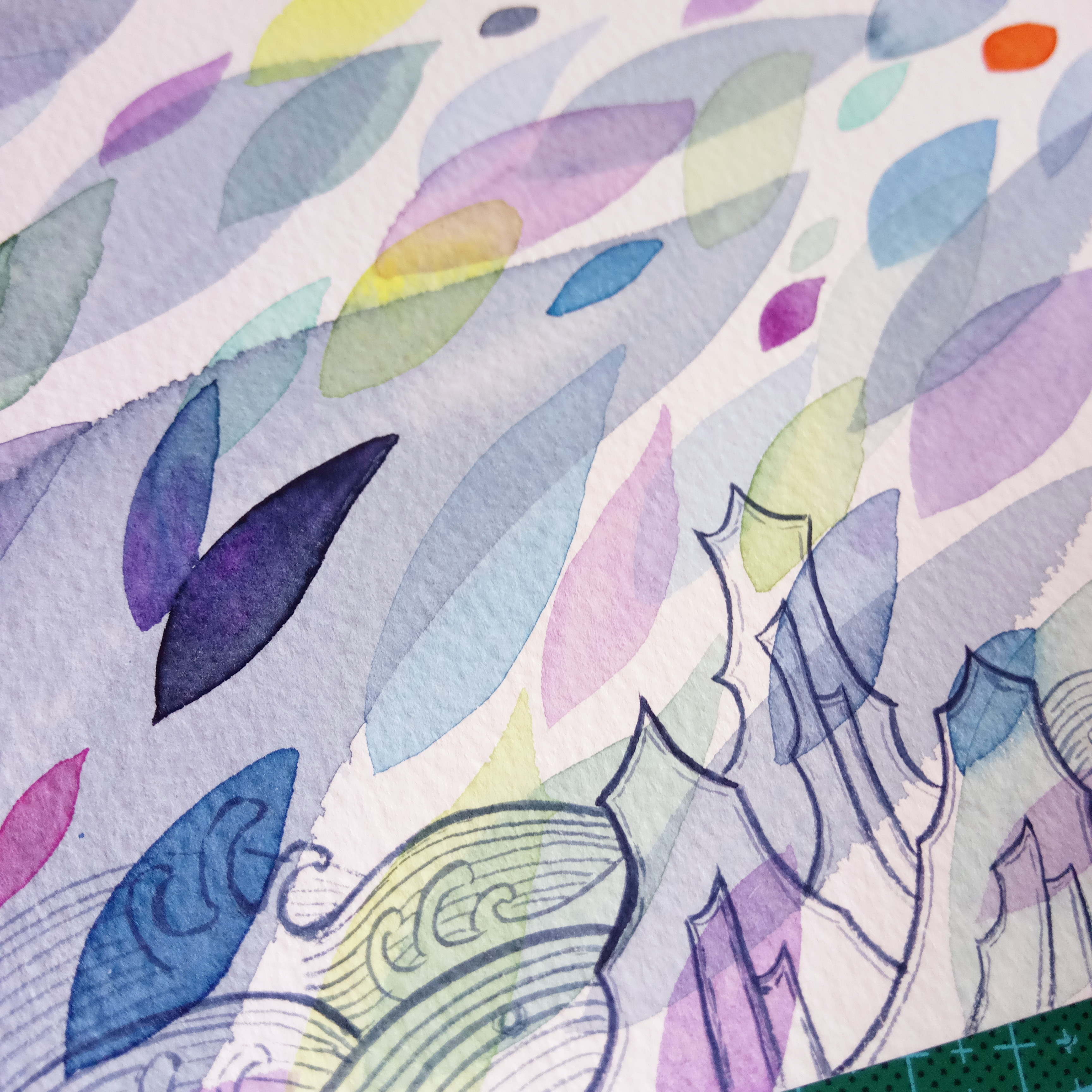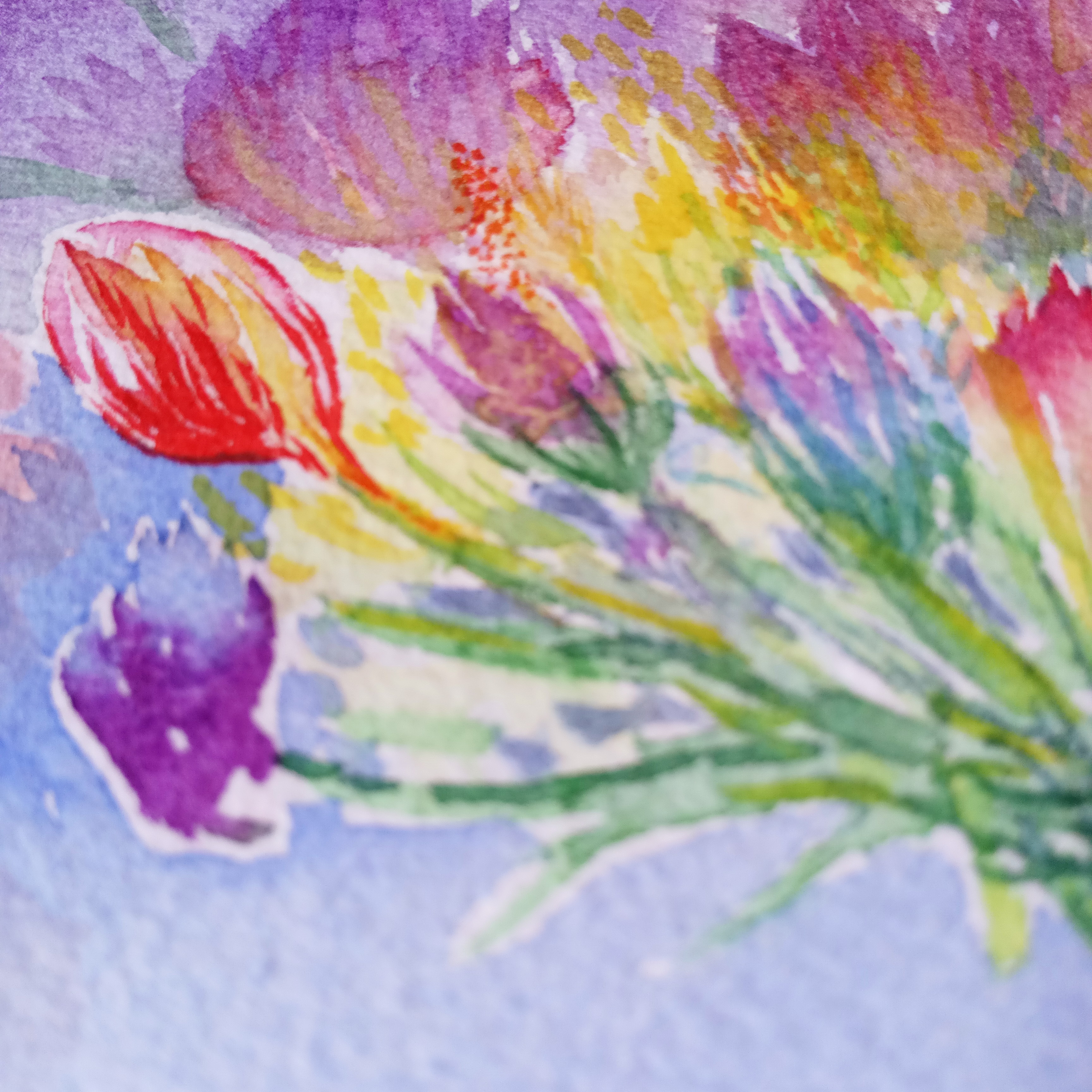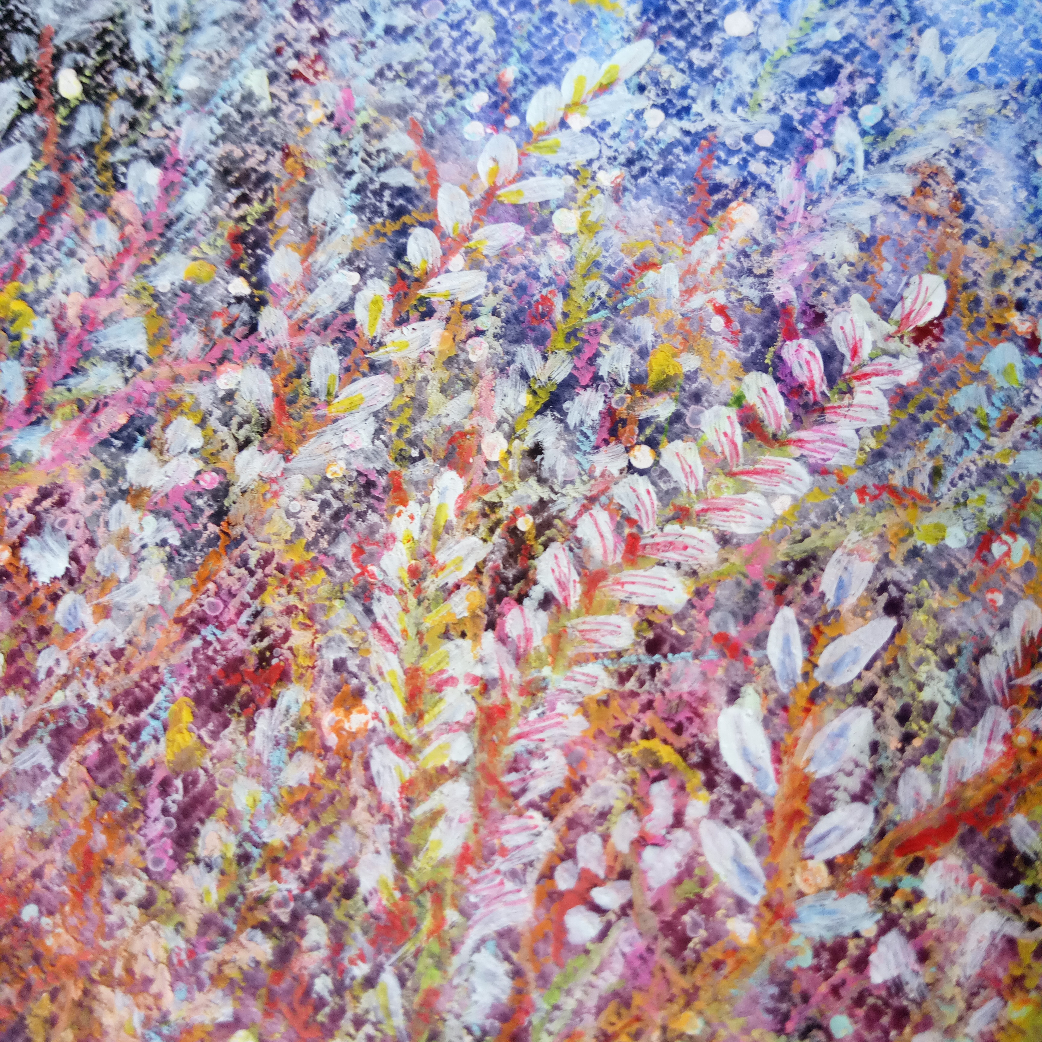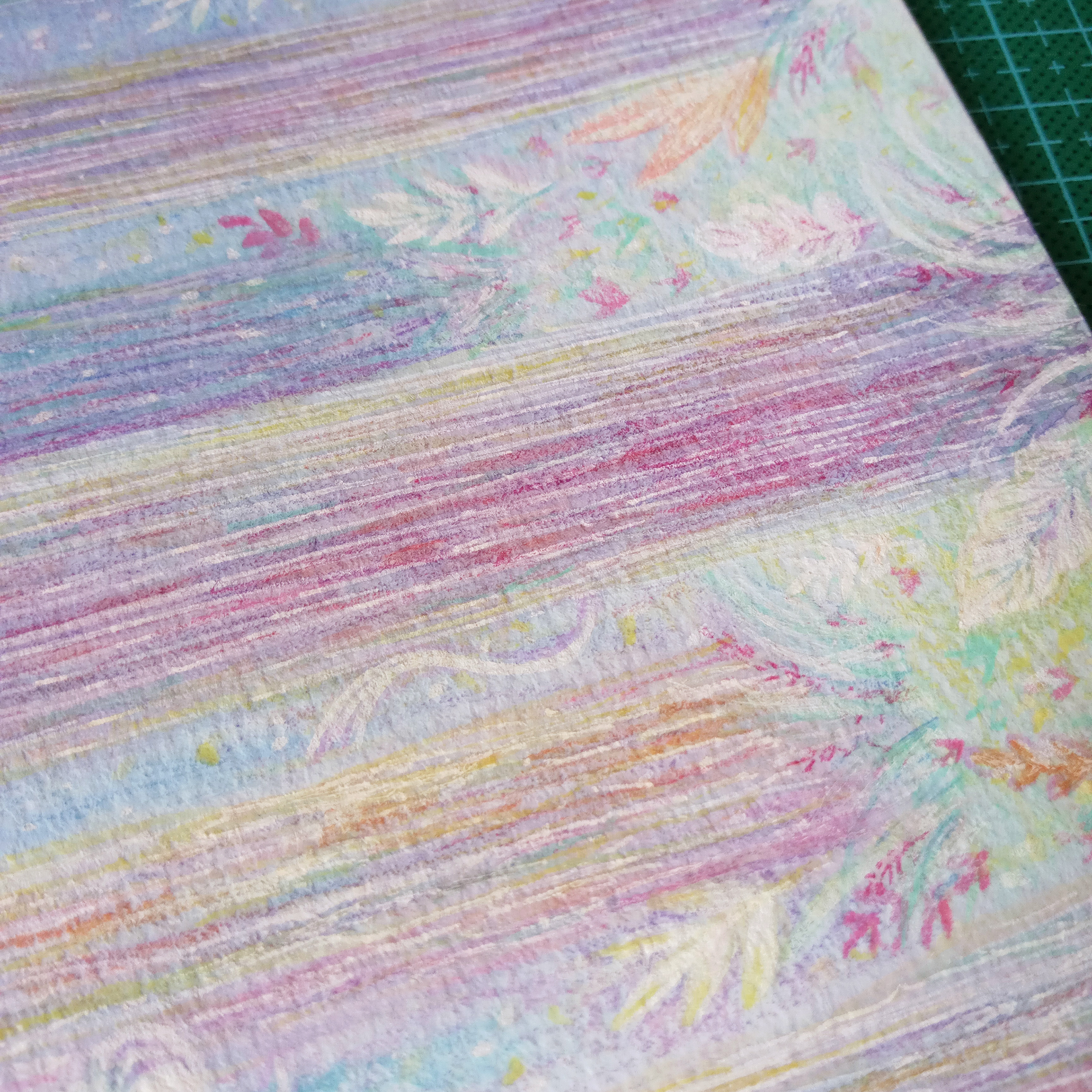 這一幅,又是一個(gè)轉(zhuǎn)折點(diǎn)咯。在材料上不拘泥于一種,大膽嘗試了一下。因?yàn)槭且粋€(gè)本子的最后一頁(yè),很興奮。大概畫(huà)的是愛(ài)的感覺(jué)。(展示局部)
