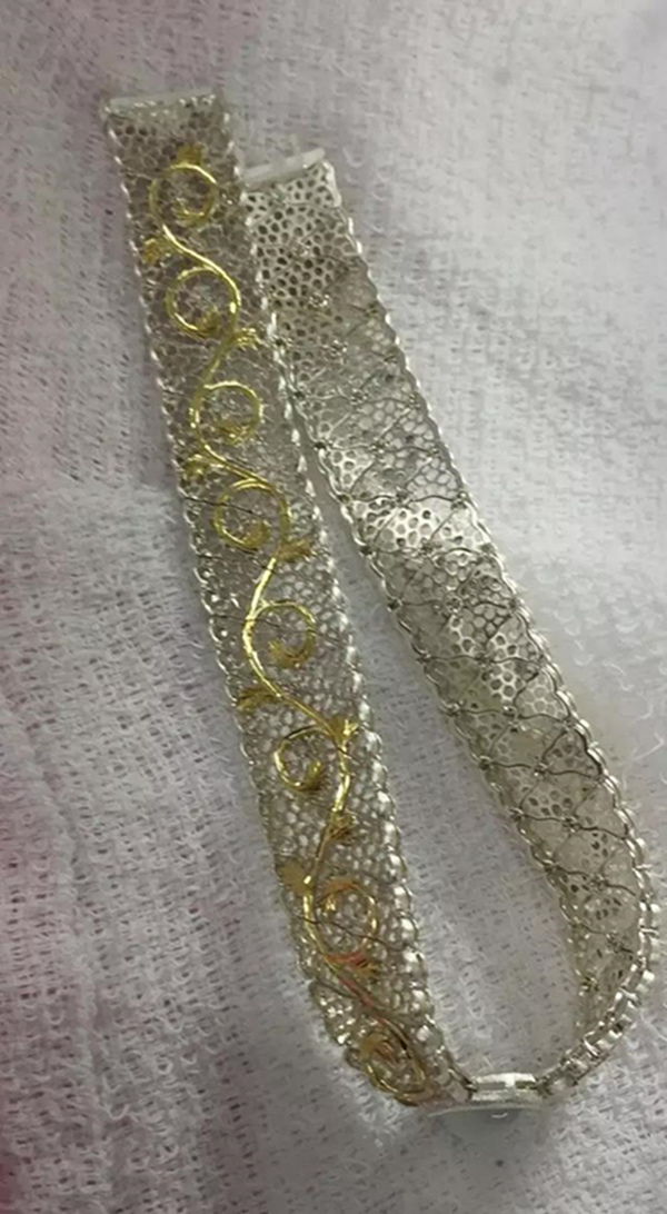 利用銀做了一條項鏈,這個項鏈的設計靈感是來自布契拉提(Buccellati)的獨門神技:織紋雕金,它是一門堪稱工藝之最的金工藝。每一個過程都要求純手工制作,每一個雕刻、鏤空穿孔、切割拋光的細節(jié)都只有使用古老的特定工具,才能賦予黃金與銀最佳的延展性和可塑性。