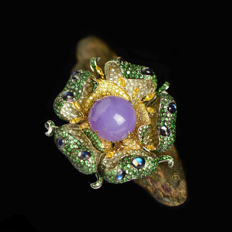 以這件作品為例,要處理的蕾絲織紋達到6000多條,且全程不得有深度差錯。經典「織紋雕金」將西方工藝完美融入東方翡翠文化之中,加上多種寶石的精致鑲嵌與花瓣柔性設計,使得作品擁有了細膩優(yōu)雅的溫度和華麗復古的東方味道。極致工藝讓花瓣每片都可顫動。