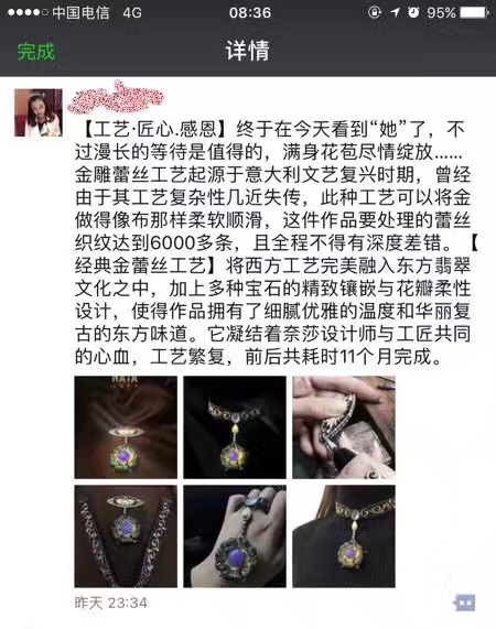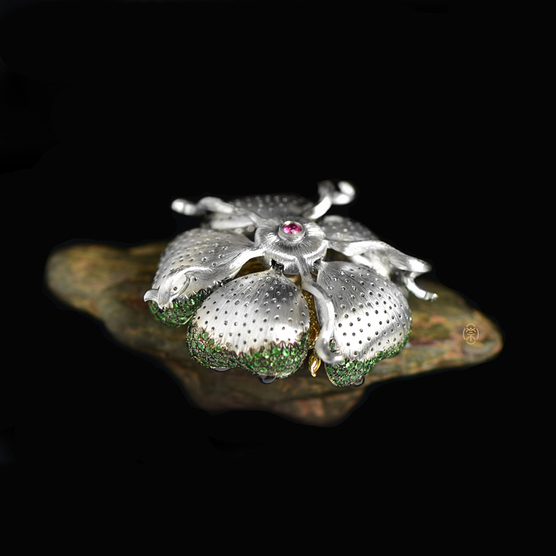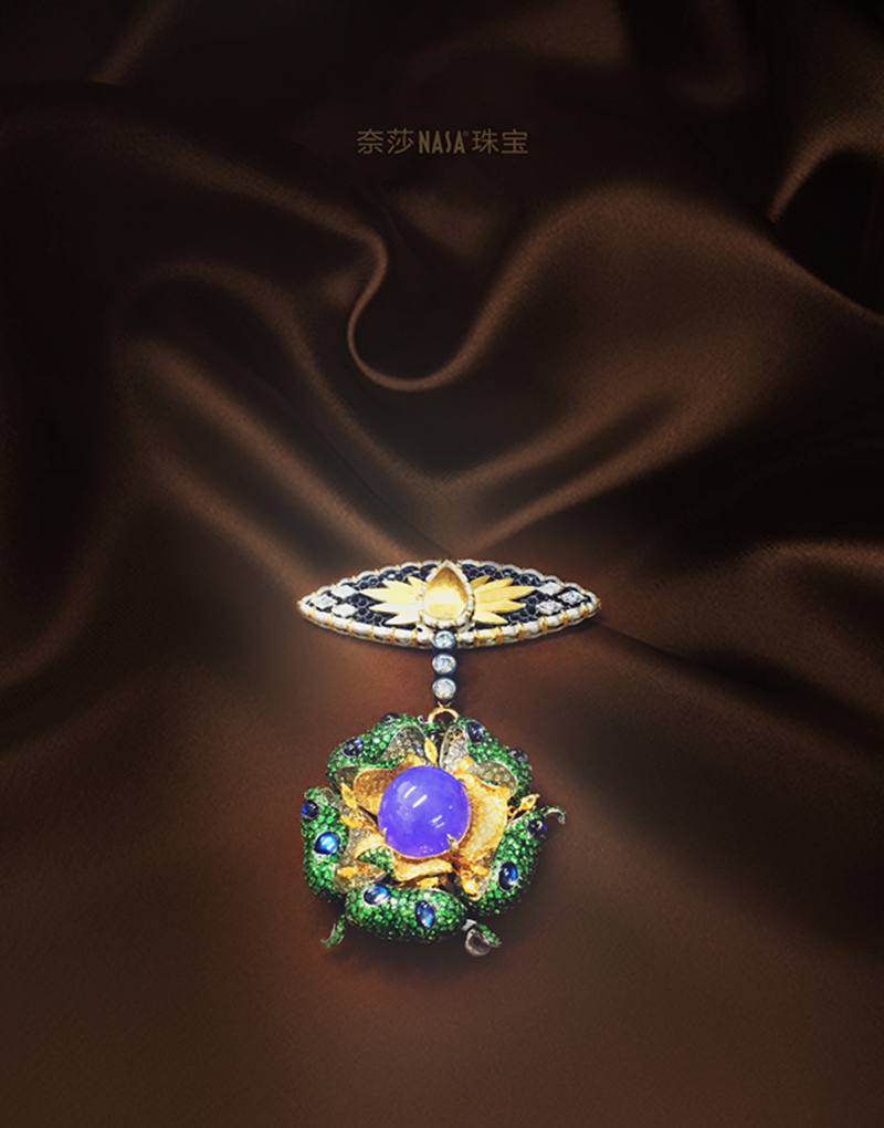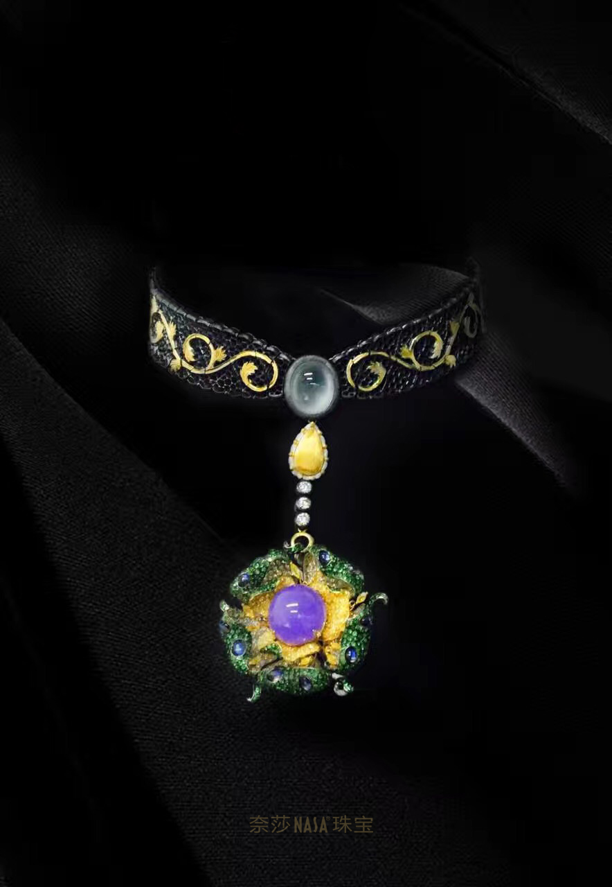 我們做了這樣一個胸針頭,繁復工藝和作品主體,以多種寶石的精致組合鑲嵌,使得作品擁有了細膩優(yōu)雅的外觀和華麗復古的風格。作品靈感來源于自然之美,運用工藝對設計做出了完美的詮釋。最后剛才那個項鏈和這個胸針頭最終是如何連接上的?成品是什么樣的呢?