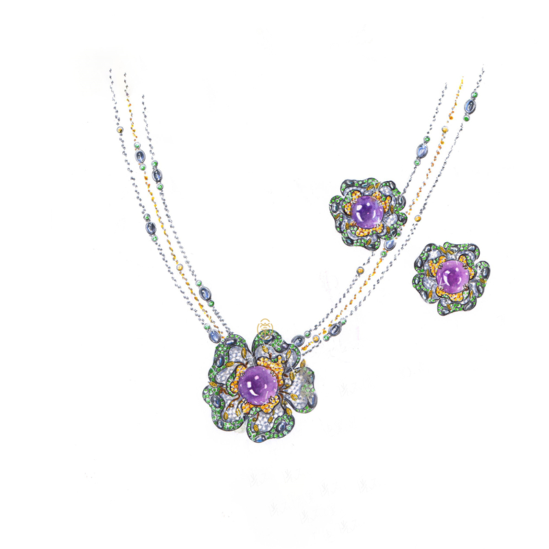 客人當時候是來了一顆紫羅蘭的主石,客戶說既要在她的預算之內,而且還要設計的漂亮大氣上檔次,呵呵....當時候給她設計了一個花型項鏈的款式,如下圖。感覺美美的有沒有?