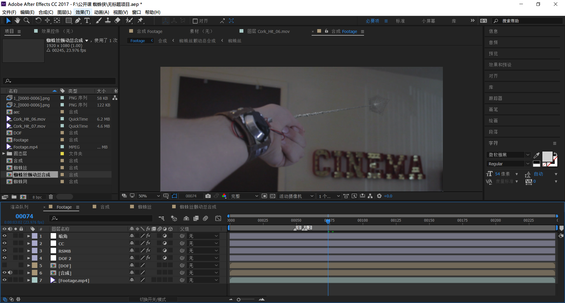 第二部分講解通過AE制作蜘蛛絲的顫動動效,同時還講解到摳圖、景深、運動模糊、顏色矯正等一系列的合成技巧。