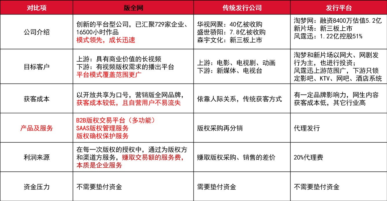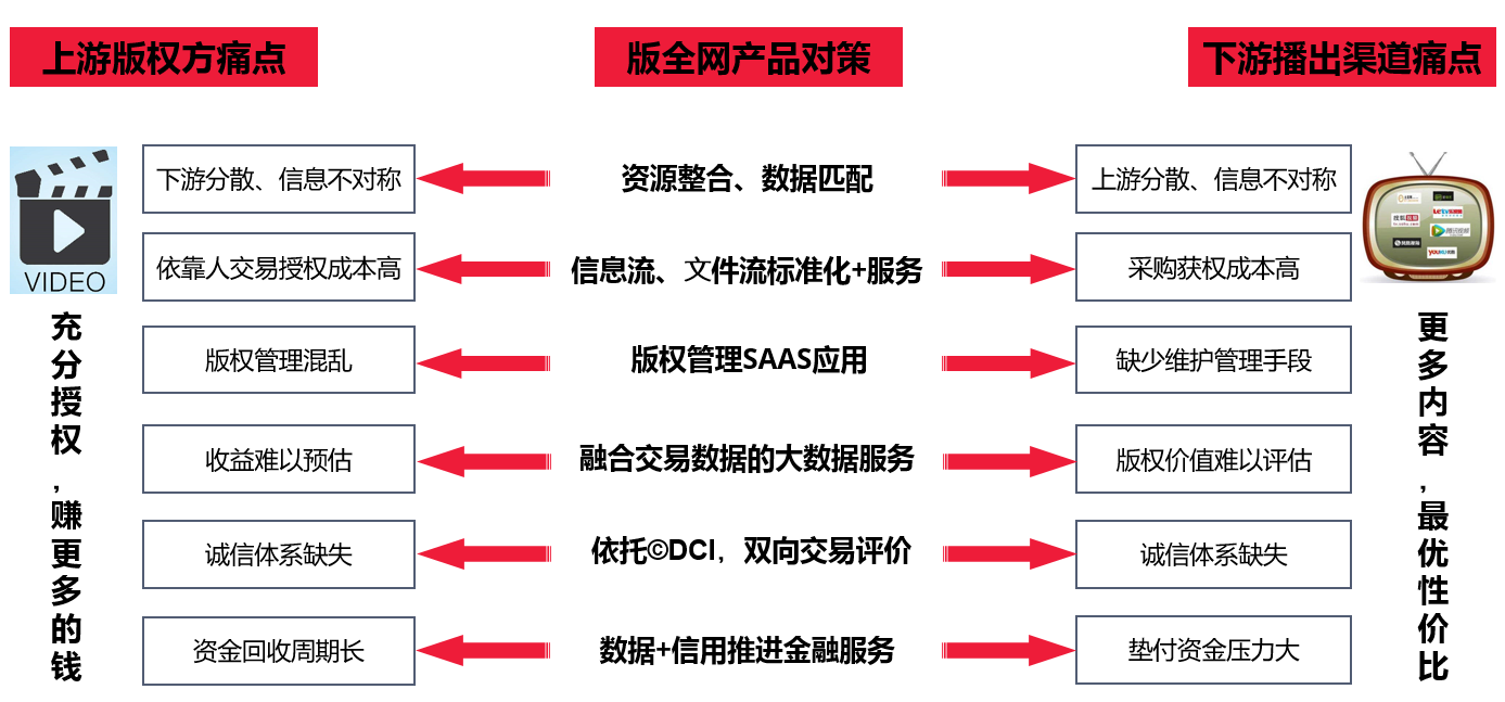 版全網(wǎng)是專注于視頻版權(quán)服務(wù)的平臺(tái),為視頻版權(quán)方和播出渠道、運(yùn)營(yíng)商提供版權(quán)授權(quán)分發(fā)與運(yùn)營(yíng)的B2B平臺(tái)和SAAS服務(wù),通過(guò)線上+線下,標(biāo)準(zhǔn)化+版權(quán)服務(wù),實(shí)現(xiàn)內(nèi)容與應(yīng)用場(chǎng)景的鏈接,使版權(quán)作品充分授權(quán),價(jià)值最大化,優(yōu)化版權(quán)供給結(jié)構(gòu),提高行業(yè)效率。