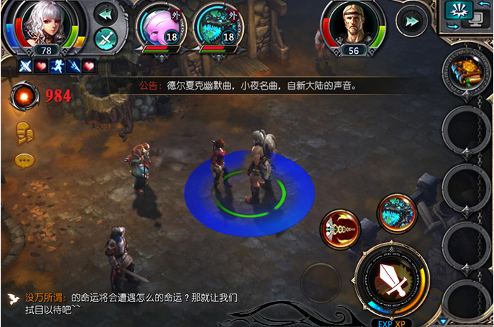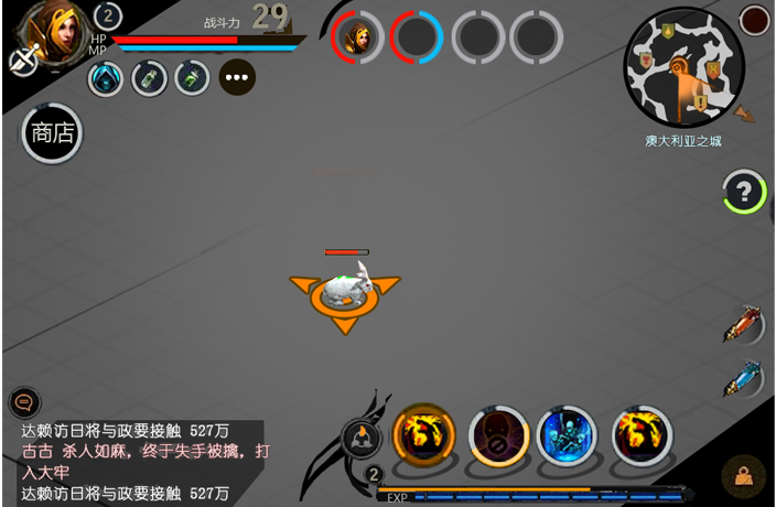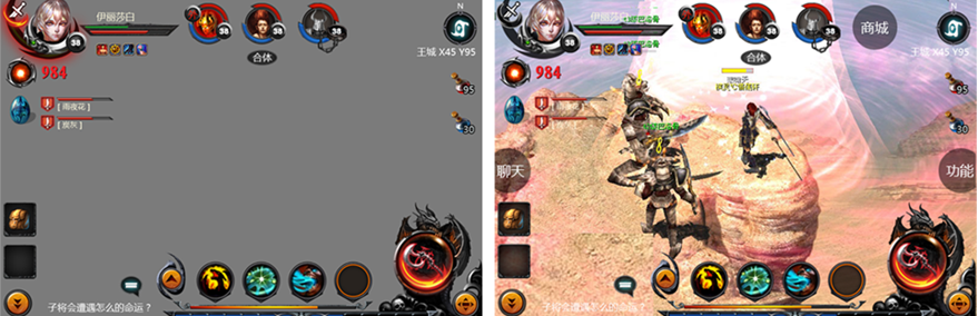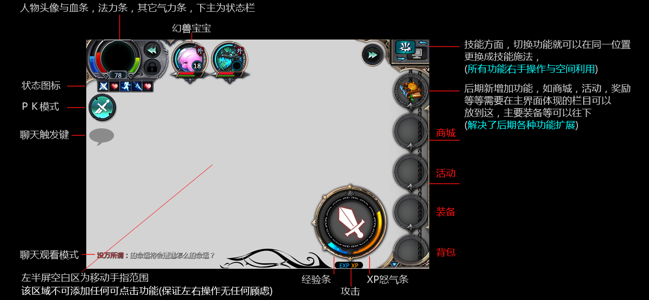 界面交互,部分保證單機(jī)與網(wǎng)游戲的共同點(diǎn)(如左上角人物,右上角功能選擇,底部經(jīng)驗(yàn)),在結(jié)合手機(jī)操作習(xí)慣(如左手移動(dòng),右手操作習(xí)慣)對(duì)本次設(shè)計(jì)進(jìn)行了創(chuàng)新。