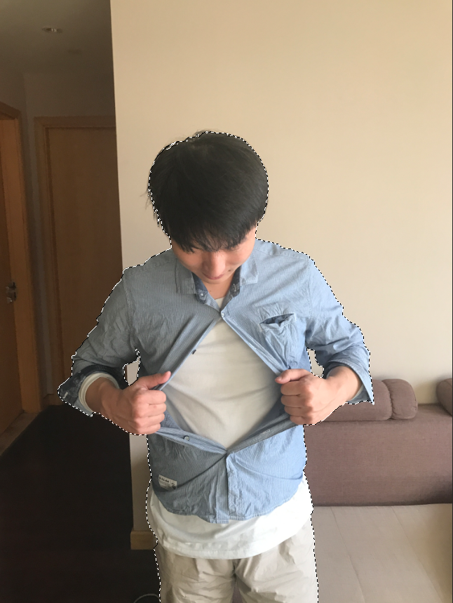 使用同樣的方法,快速選擇選中中間白色衣服部分。輸出新建帶有圖層蒙版的圖層,這里因?yàn)槲覀兪窍肴コ虚g白色而不是保留,而黑色為隱藏白色為顯示。所以我們點(diǎn)擊選中蒙版,ctrl+i,反相。得到了沒(méi)有肚子的人物。