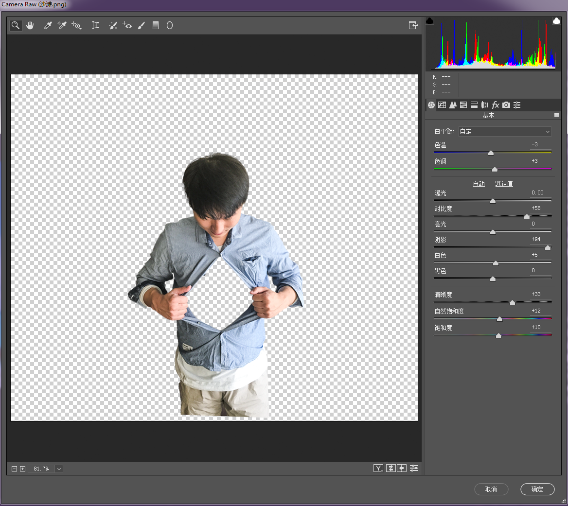 整體人物灰蒙蒙的,過(guò)暖,清晰度也不夠,我們打開(kāi)濾鏡中的camera raw,降低一點(diǎn)點(diǎn)色溫,提高對(duì)比度來(lái)去除灰的感覺(jué)。陰影部分太深了我們調(diào)亮些,清晰度調(diào)高些。調(diào)節(jié)自然飽和度和飽和度稍高些。確定。