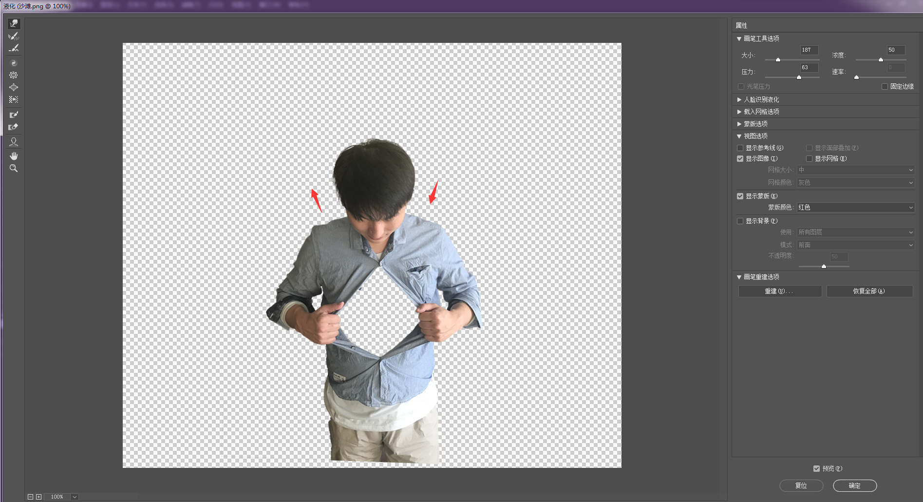 轉(zhuǎn)換為智能對(duì)象,來(lái)到濾鏡-液化里面,涂抹推,把兩邊的肩調(diào)平齊,讓志豪顯得魁梧一點(diǎn)。確定后ctrl+t旋轉(zhuǎn)調(diào)整水平位置。