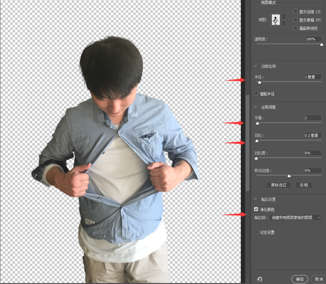 怕?lián)覆桓蓛粢晥D可以選擇黑底,半徑給一點(diǎn),也可以勾選智能半徑,給一點(diǎn)平滑,勾選凈化顏色,去除掉原本背景中的黃色,直接在人物邊緣點(diǎn)擊涂抹。最后輸出到 新建帶有圖層蒙版的圖層。