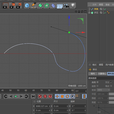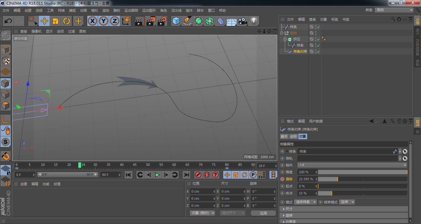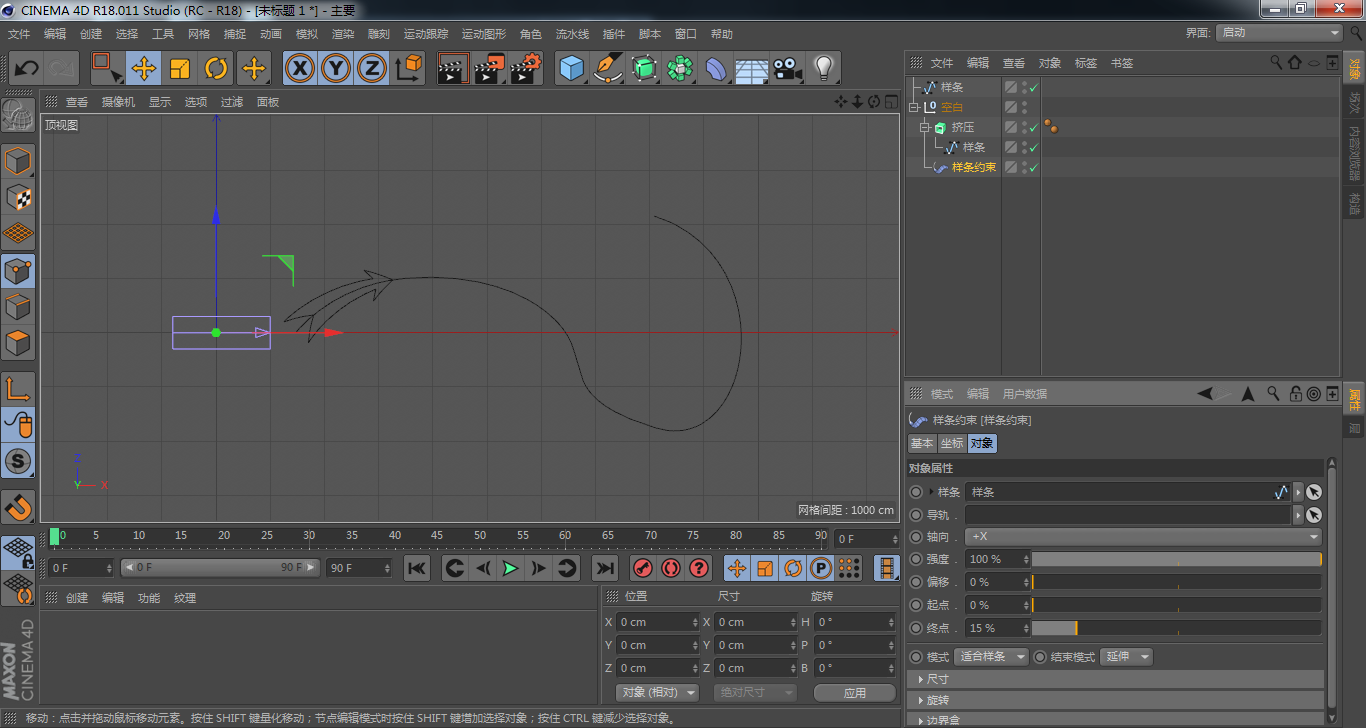 5.為添加“擠壓”的箭頭添加“樣條約束”,并將上一步中繪制的樣條線拖曳到樣條選框中——為了盡量保持箭頭的可編輯性,可以將擠壓的箭頭和樣條約束放置于同一個(gè)組中,如果已經(jīng)確定箭頭的形狀不會(huì)發(fā)生變化,也可以首先將“擠壓”與箭頭合并,然后再添加“樣條約束”——調(diào)整終點(diǎn)值使箭頭長度適中。