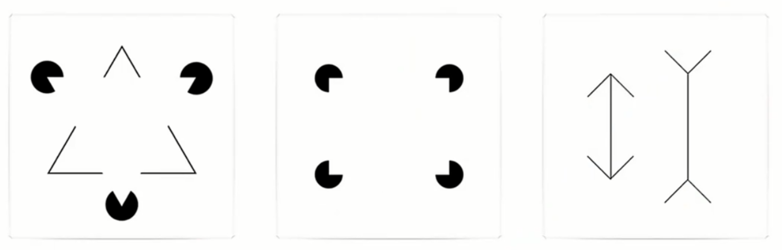 人腦會(huì)自動(dòng)補(bǔ)齊畫面中的三角形、長(zhǎng)方形,線的長(zhǎng)短(其實(shí)第三幅圖的兩段線是同樣長(zhǎng)的)。