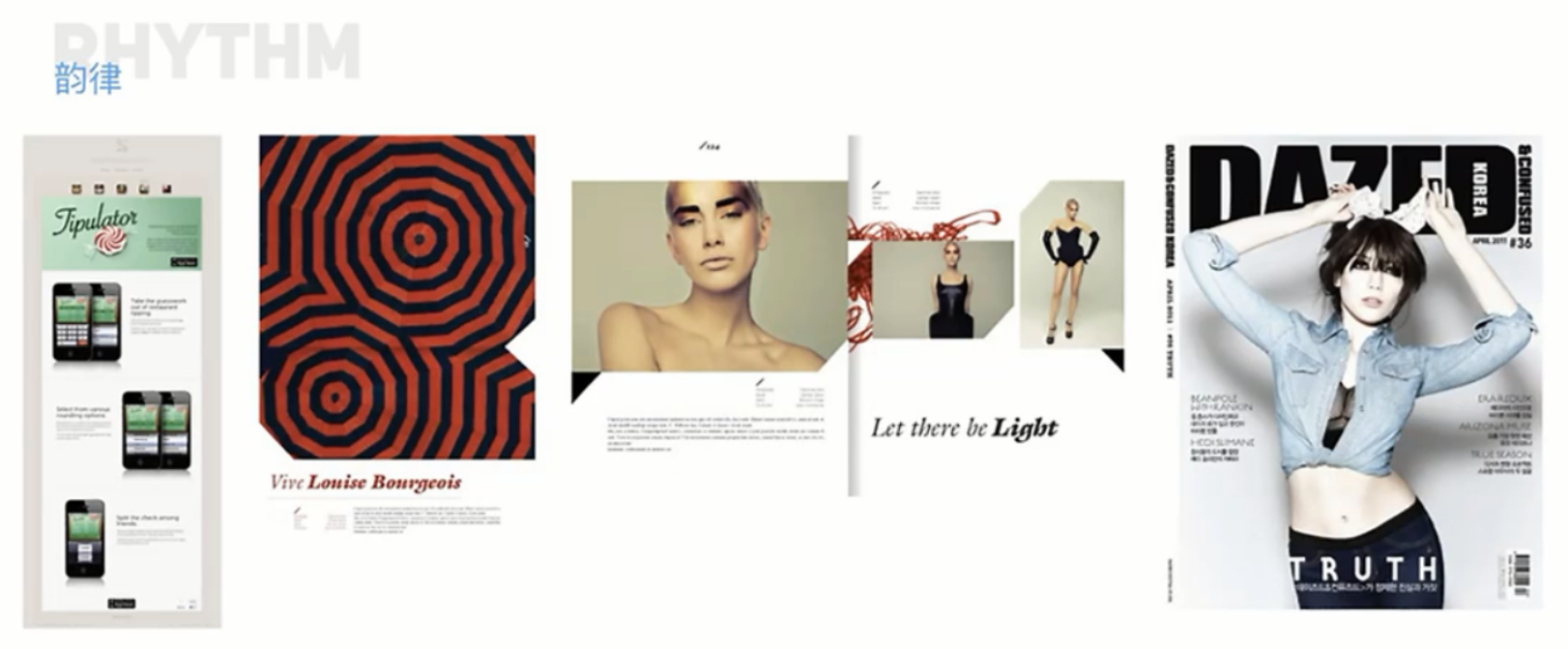 在版面構(gòu)成中,節(jié)奏和韻律指的是同一圖案在一定的變化規(guī)律中,重復(fù)出現(xiàn)所產(chǎn)生的運(yùn)動(dòng)感。由于節(jié)奏和韻律有一定的秩序美感,所以在生活中得到了廣泛的應(yīng)用。