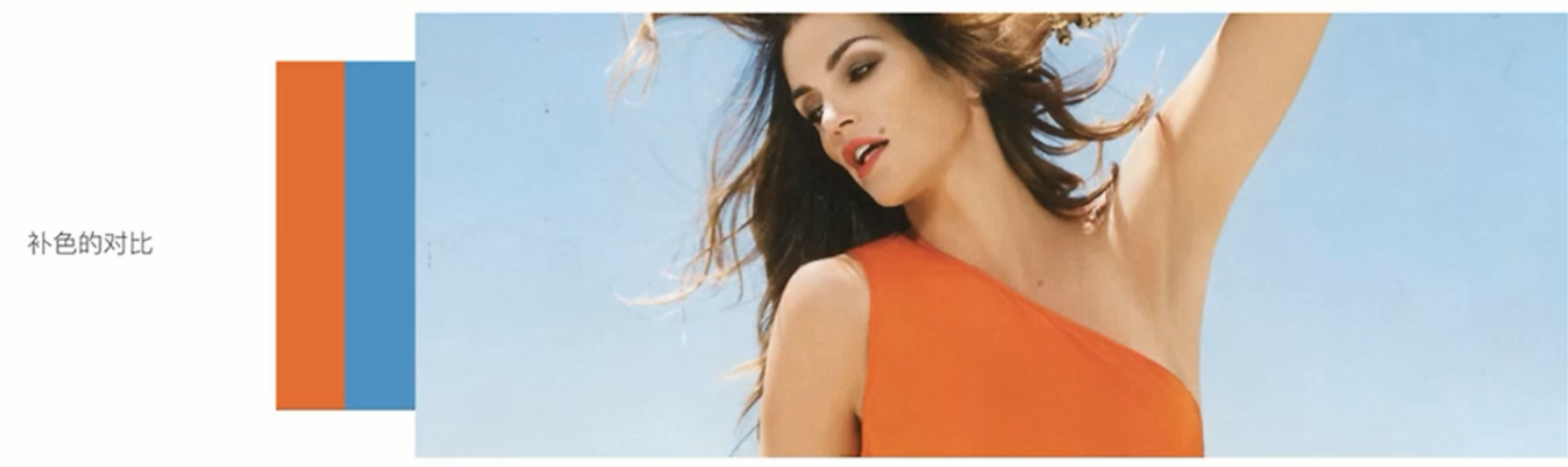 對(duì)比色:指色相環(huán)上色相區(qū)別較大、純度較高的任意兩色。對(duì)比色直接無過多的共性,對(duì)比效果強(qiáng)烈。