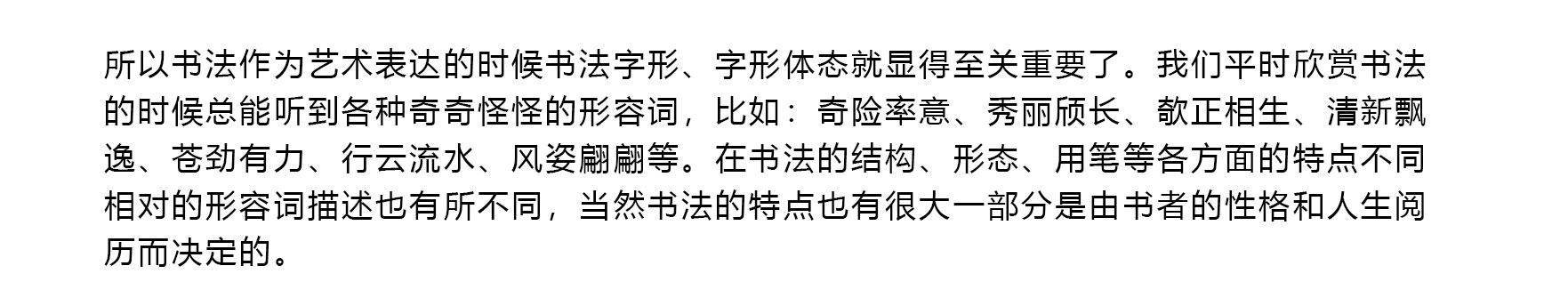 書法是有姿態(tài)的,不同的漢字有不同的姿態(tài),不同的姿態(tài)也能體現(xiàn)出不同的字體性格。