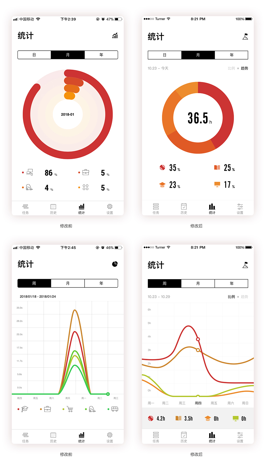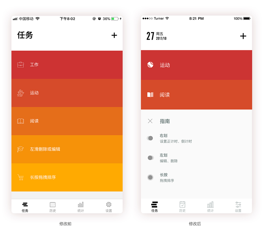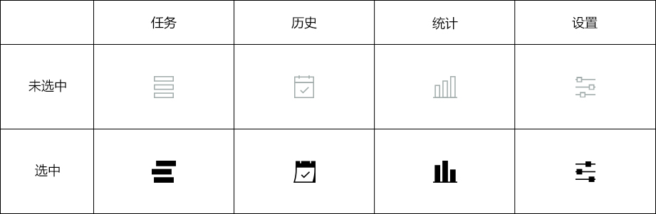 將任務(wù)的空心圖標(biāo)換成實(shí)心圖標(biāo):這些圖標(biāo)源于生活,延續(xù)物體原本含義,識(shí)別速度取決于色彩和形狀對(duì)視覺(jué)的吸引程度,圖標(biāo)更容易識(shí)別和區(qū)分。