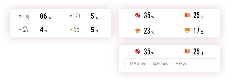 原處的圖標(biāo)和數(shù)字間的距離太大,顯得關(guān)聯(lián)性不夠,所以適當(dāng)縮小兩者間的間距。按圖標(biāo)進(jìn)行比例占比,所以一個(gè)圖標(biāo)也會(huì)有很多不同項(xiàng)目,所以設(shè)計(jì)點(diǎn)擊圖標(biāo)或數(shù)字后展開(kāi)所含不同任務(wù)的占比。