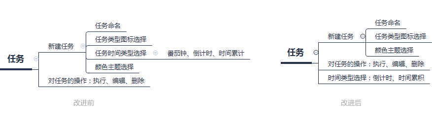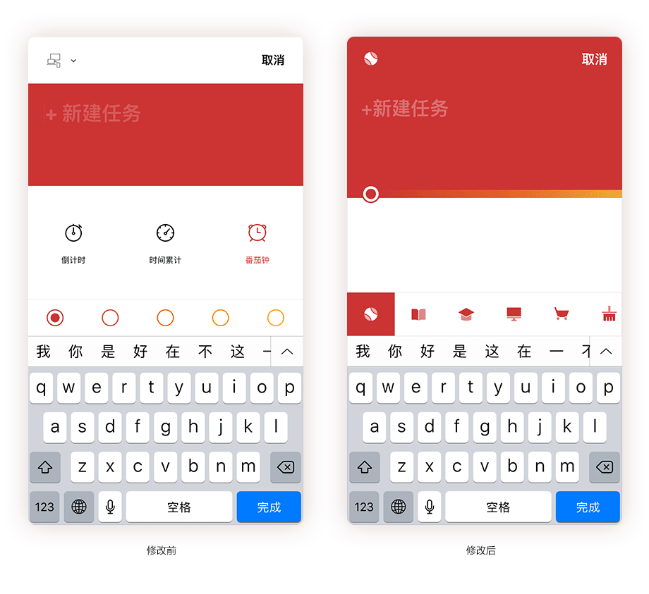 1、將新建任務(wù)里的時(shí)間類型選擇提出,默認(rèn)為番茄鐘。這么做的考慮有兩點(diǎn):
