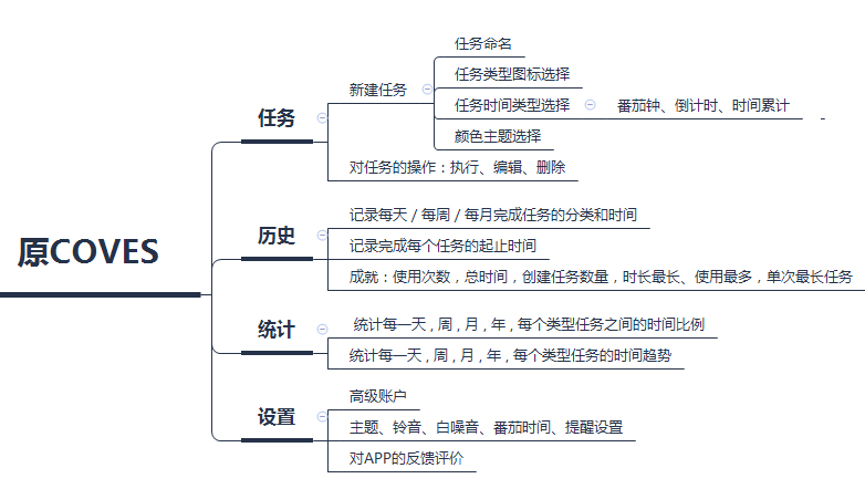 總結(jié):Coves-番茄鐘APP的目的是讓用戶集中精力完成事件,排除干擾,合理安排休息時(shí)間的方式,使用戶能更有效率、更健康的完成事件。