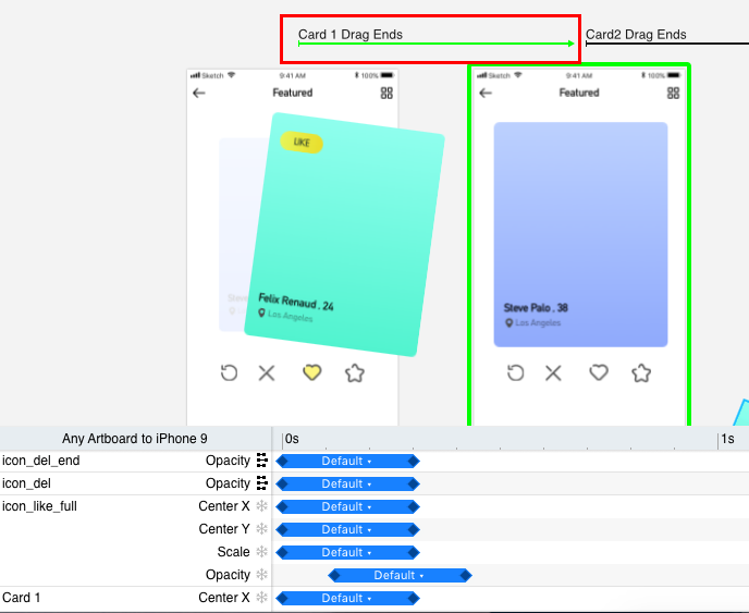 當(dāng)觸發(fā)事件發(fā)生時 (必須是兩個畫板圖層之間),Principle會自動創(chuàng)建兩個畫布之間都用的圖層之間的逐幀的補間動畫,逐幀的實現(xiàn)屬性間的變化。時間軸面板可以調(diào)節(jié)屬性的快慢、錯幀等。(點擊畫板上方的箭頭可以調(diào)出動畫面板)
